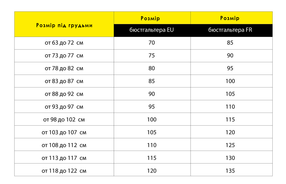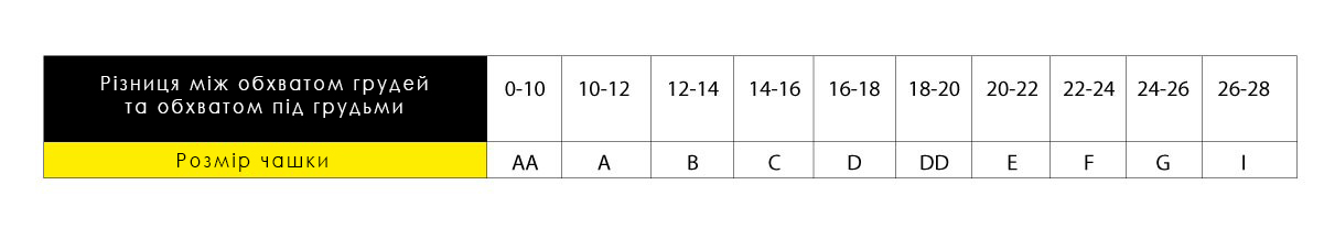 Враховуючи показник обхвату під грудьми (71 см), виберіть розмір бюстгальтера. Розмір – 70.
