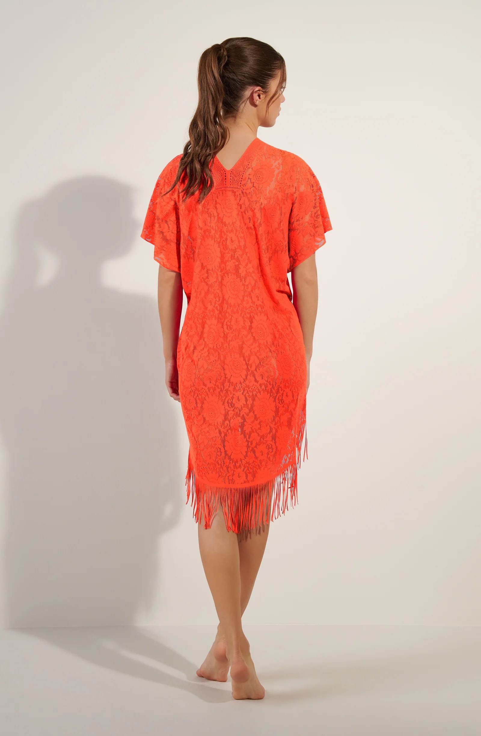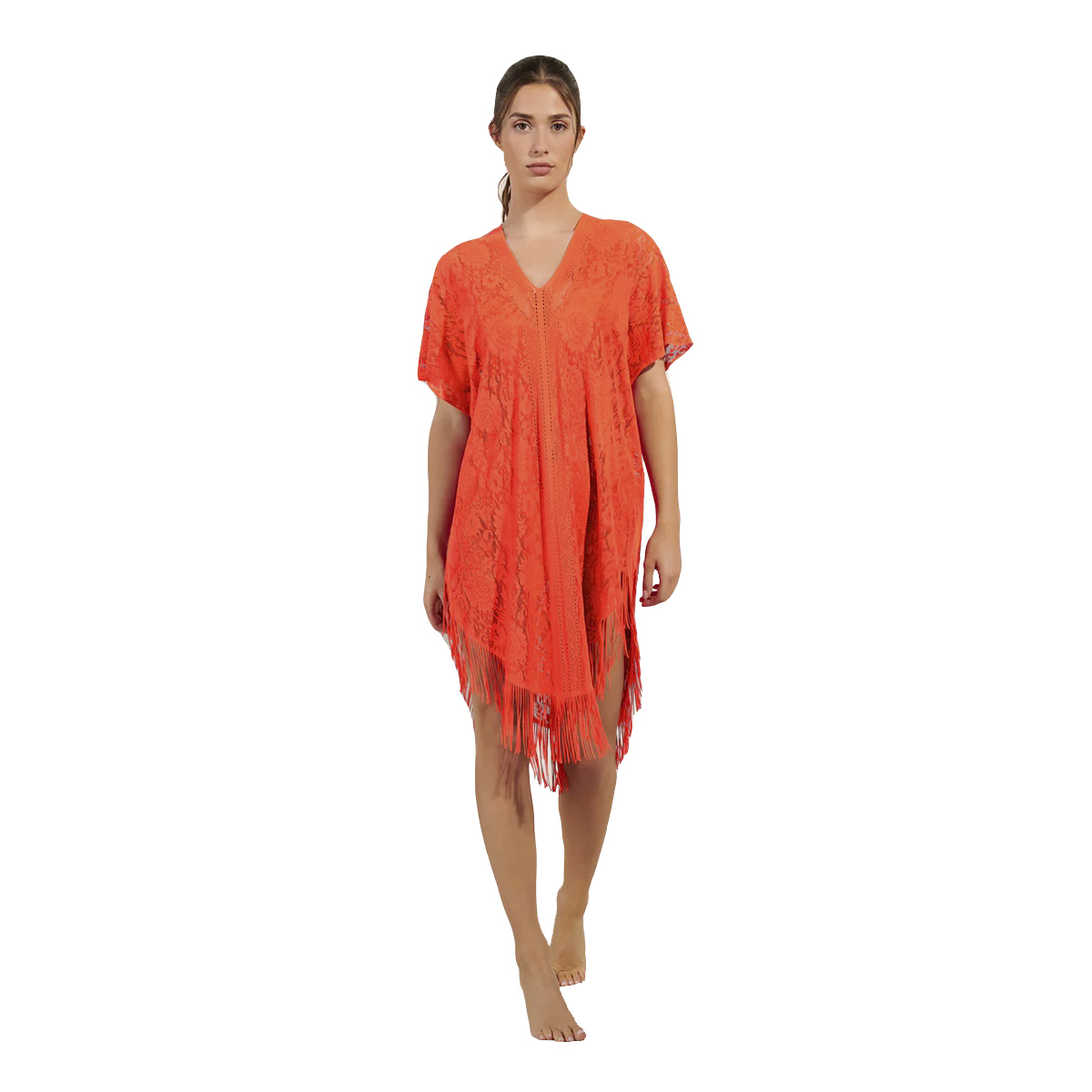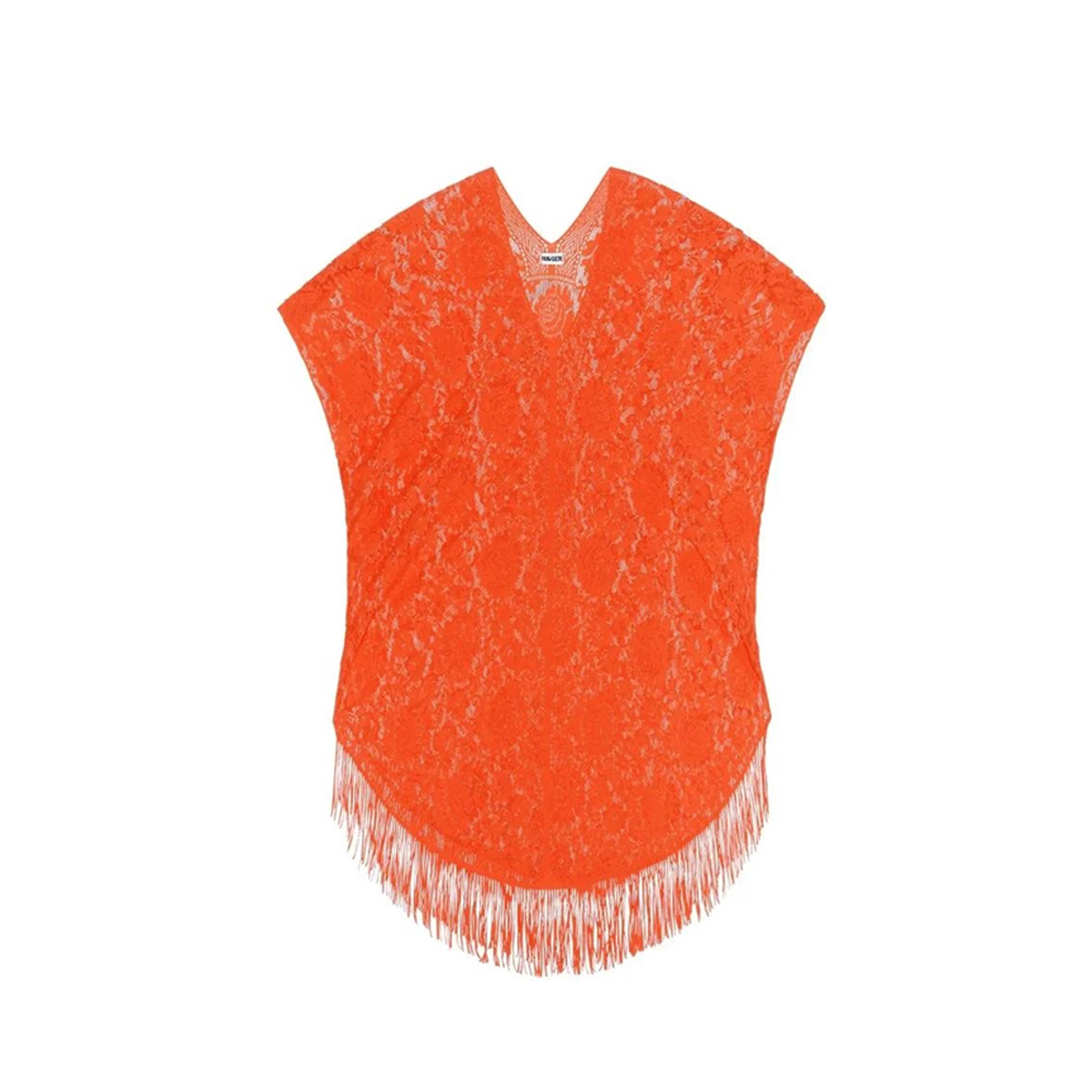 Туніка-пончо вільного крою, виготовлена ​​з ніжного мережива з квітковим орнаментом. Нижній край та декорований бахрамою.