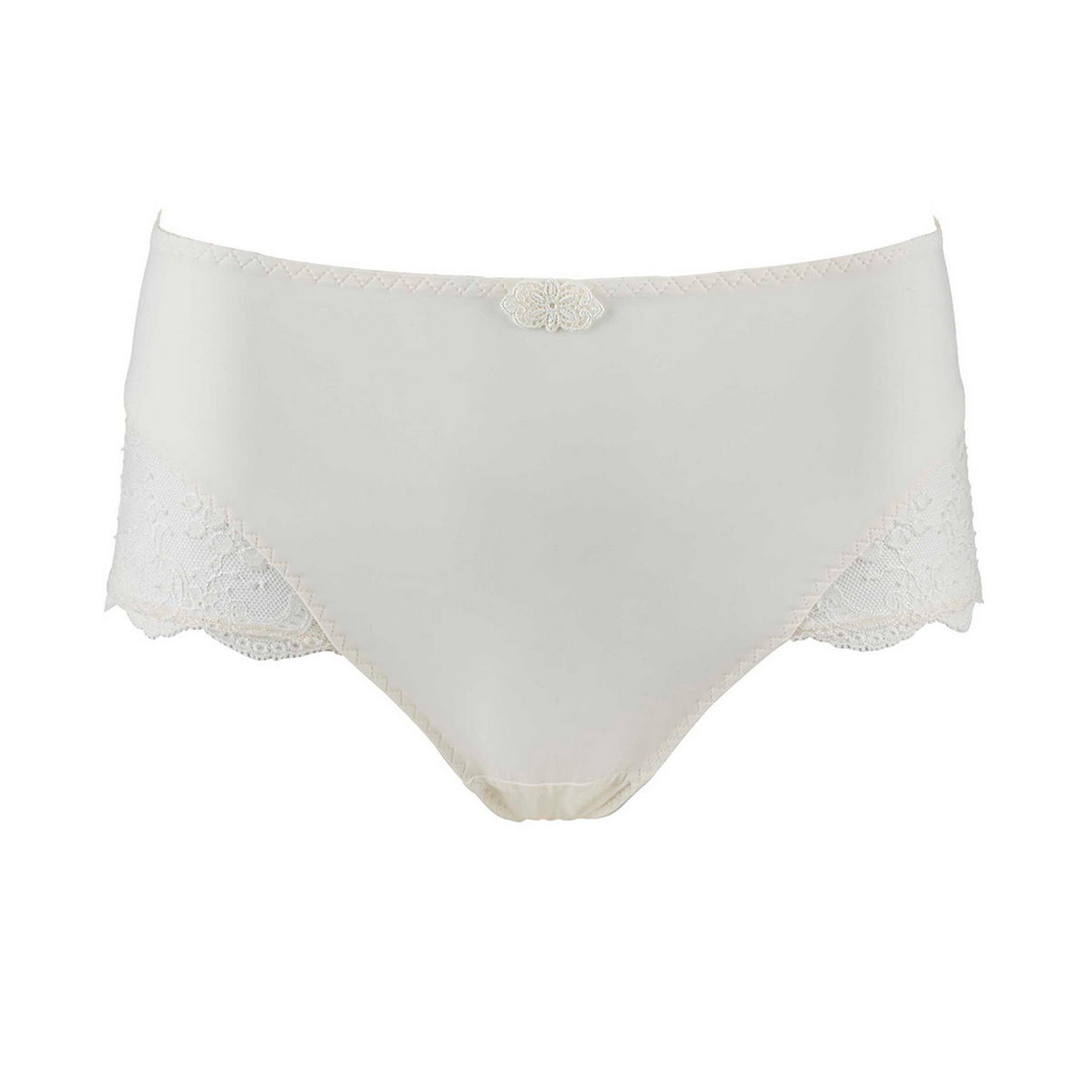 Труси з високою талією. Передня та задня панелі виконані з непрозорої мікрофібри. Мереживні вставки, з мережива "Leavers", прикрашають нижній край передньої панелі. Декоративний елемент з гіпюру – на передній панелі. Необроблений край задньої панелі робить модель невидимою під одягом.