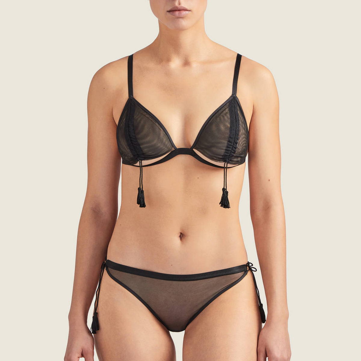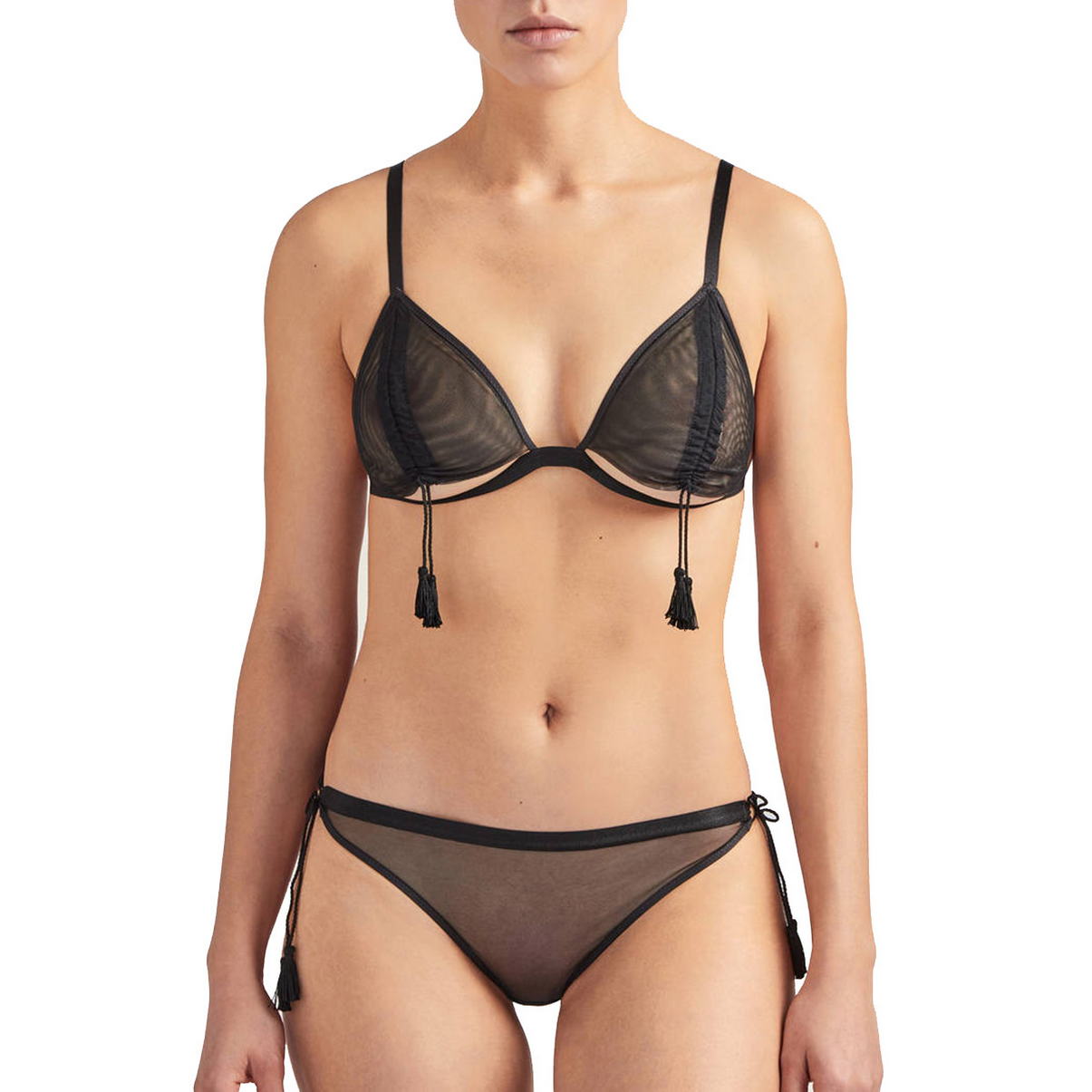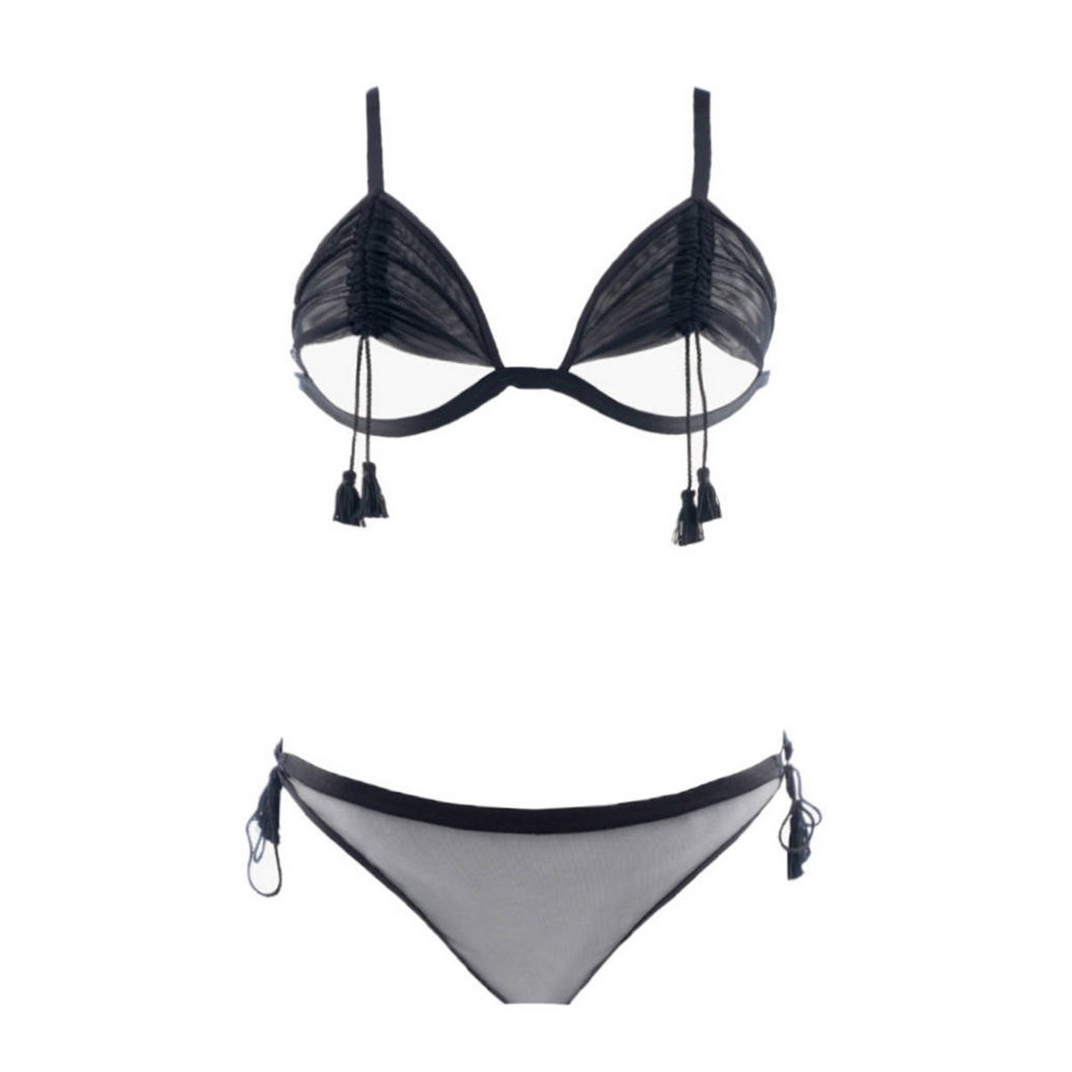 Коплект: бюстгальтер та труси. Бюстгальтер з м'якою трикутною формою чашки. Без кісточок. Чашки виготовлені з прозорого тюлю і оснащені шнурівкою, що регулюється, з китичками, яка дозволить оголити Ваші груди. Регульовані бретелі та задня панель. Труси – стрінги із середньо-заниженою посадкою, повністю виготовлені з прозорого тюлю. Бічні панелі регулюються.