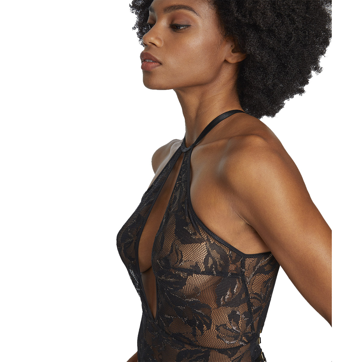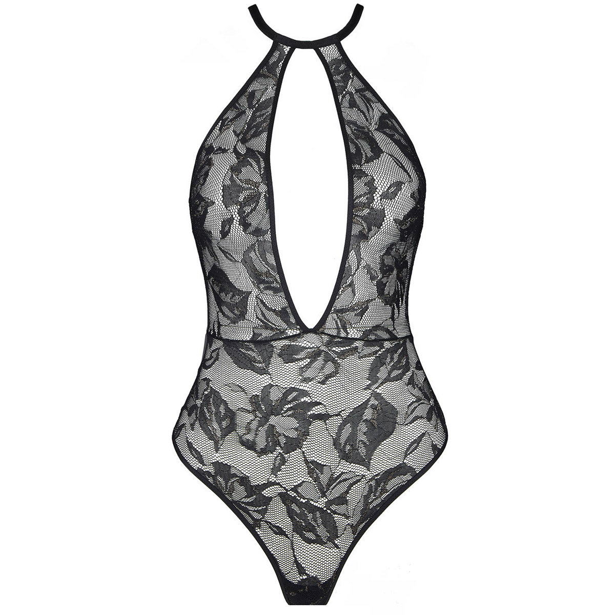 Боді - із жаккардового мережива з квітковим орнаментом, який доповнений люрексовою ниткою. Боді без чашок, без кісточок, форма трусів – стрінги. На задній панелі – переплетення атласних смуг, за допомогою яких регулюється розмір. Застібка – ззаду на гачку.