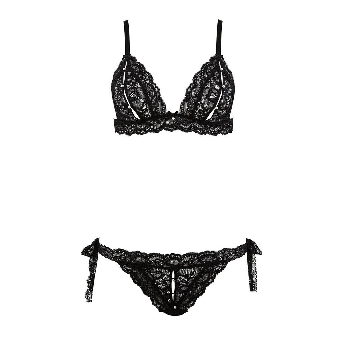 Комплект: бюстгальтер та труси. Бюстгальтер, виготовлений з мережива з квітковим мотивом, з м'якою трикутною формою чашок декорований ґудзиками-перлинами, за допомогою яких можна оголити Ваші груди. Регульовані бретелі та застібка. Труси також виконані з мережива, на зав'язках, декоровані ґудзиками-перлинами, що розстібаються.