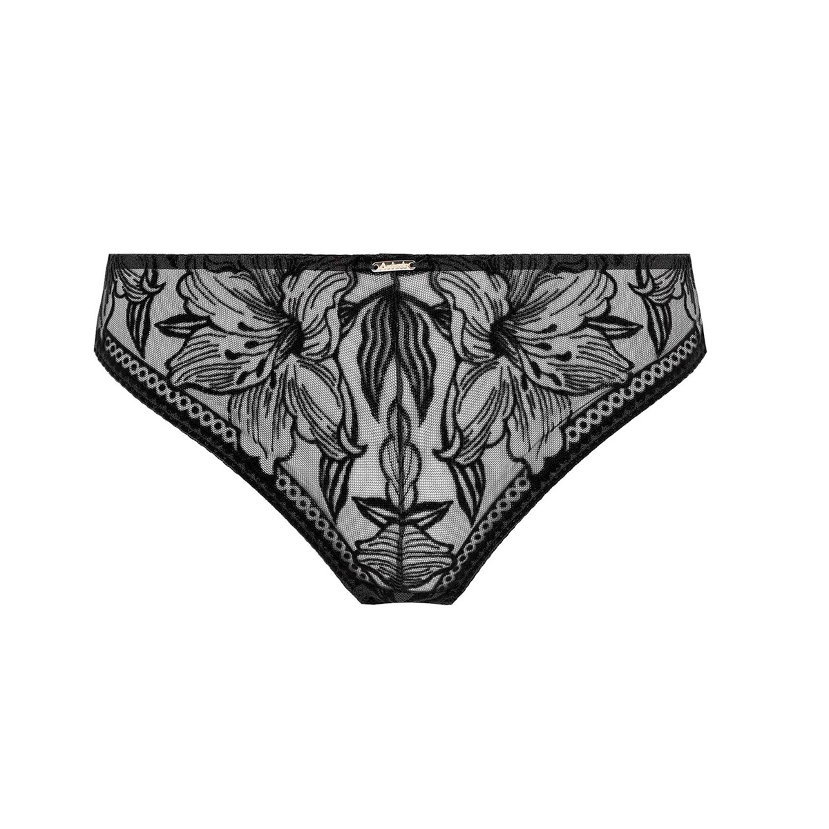 Труси – класичні із середньо – заниженою посадкою. Практично повністю виконані з тюлю з вишивкою з оксамитовим напиленням. На передній панелі розмістився металевий аксесуар із логотипом. На задній панелі – декоративна "крапелька", доповнена вставками з гіпюру. Необроблені краї на задній панелі.
