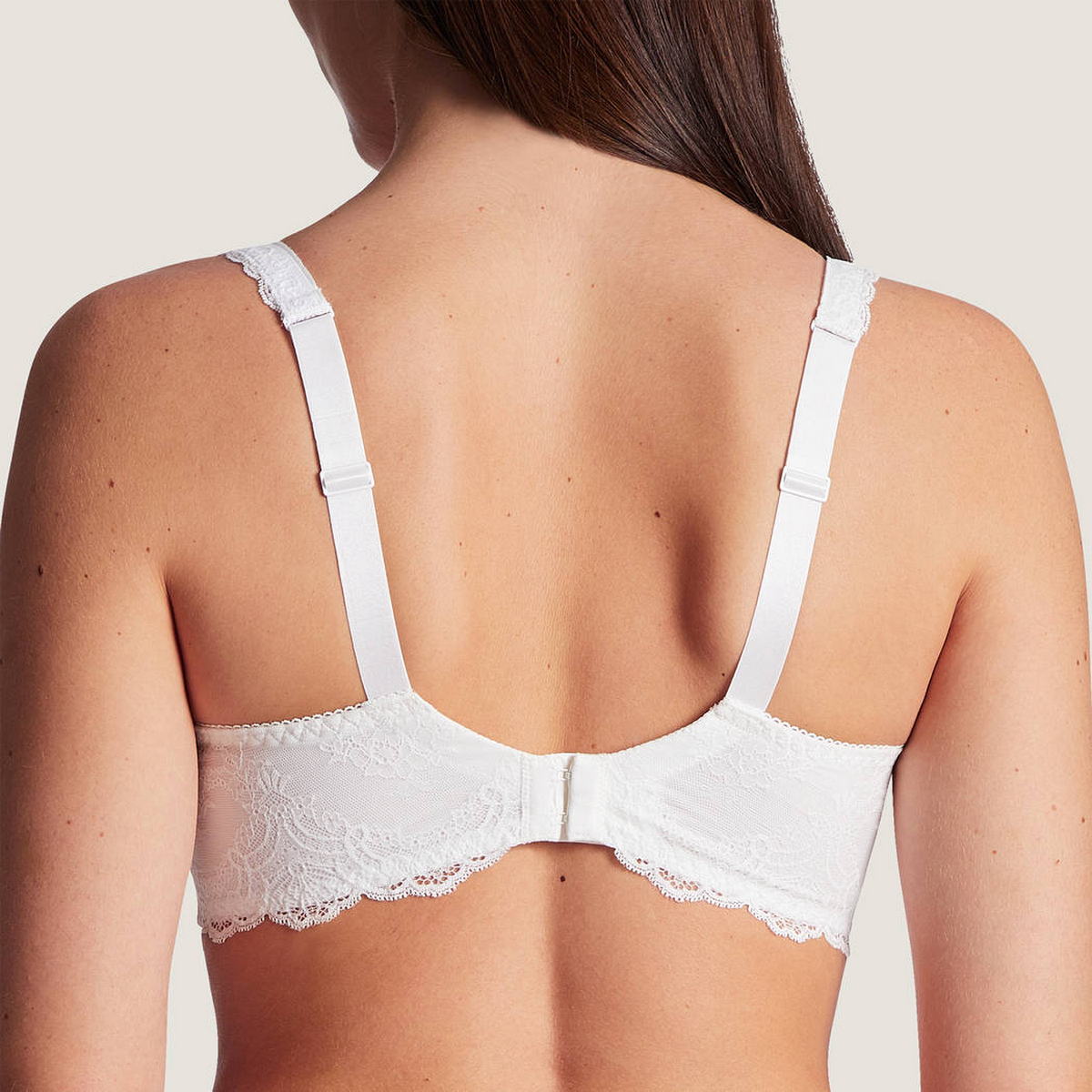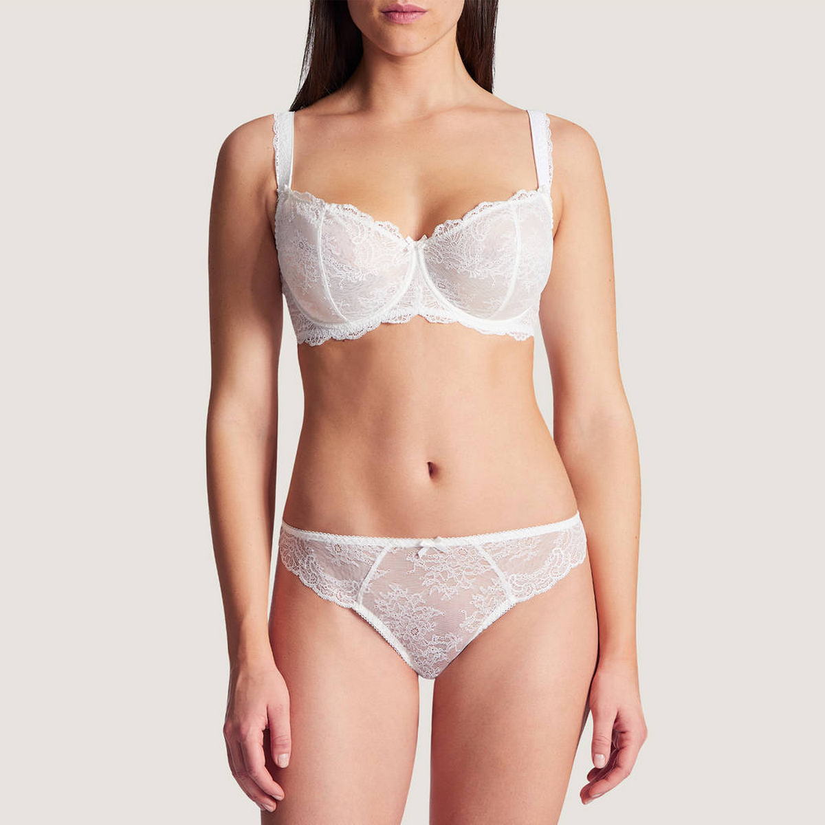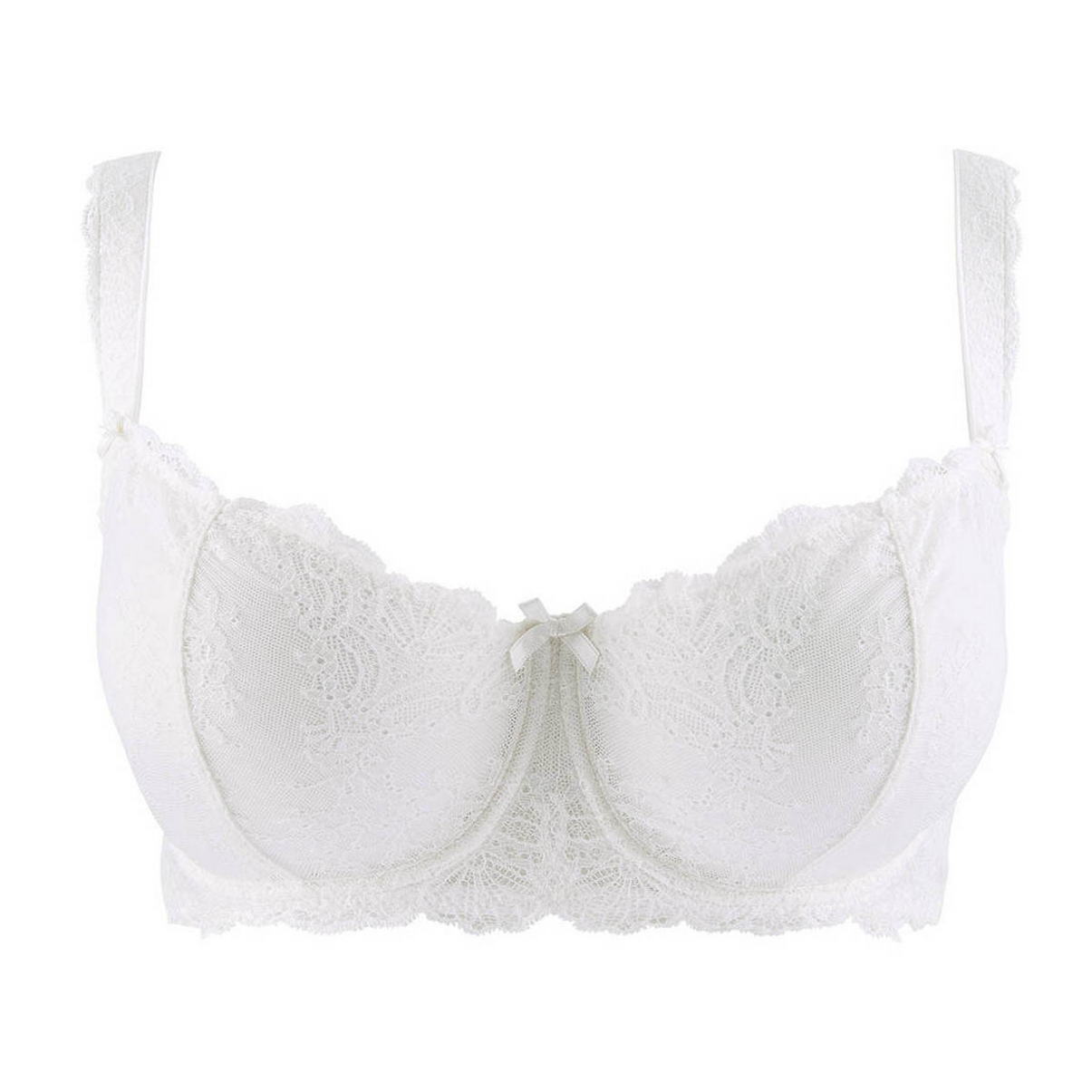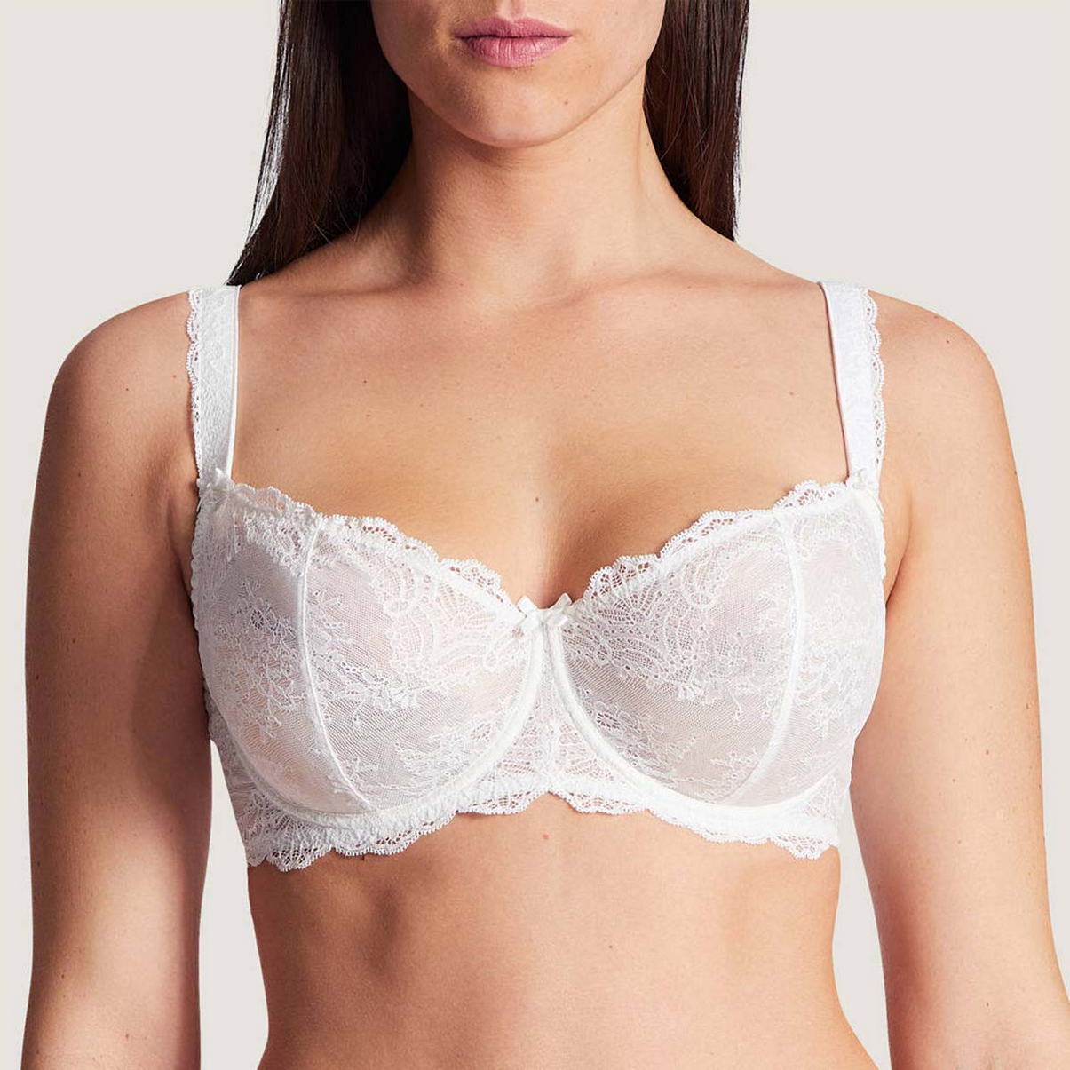 Бюстгальтер-балконет-комфорт. Новий бестселер від "Aubade", створений за прототипом відомої "анжеліки" і призначений для великих грудей. Бюстгальтер з м'якою відкритої форми чашок на кісточках. Чашки виготовлені з мережива з квітковим орнаментом, з внутрішнього боку дубльовані тюлем для надання необхідної підтримки. "Балетна" спинка, задні панелі також виготовлені з мережива та дубльовані тюлем. Широкі бретелі, що регулюються. Центральна панель та основи бретелів декоровані атласним бантиком.