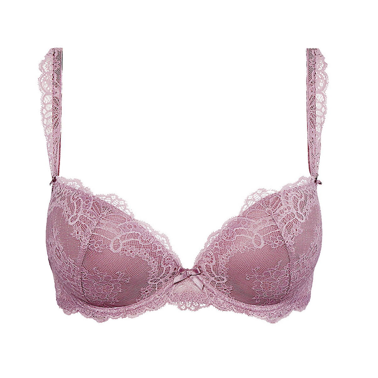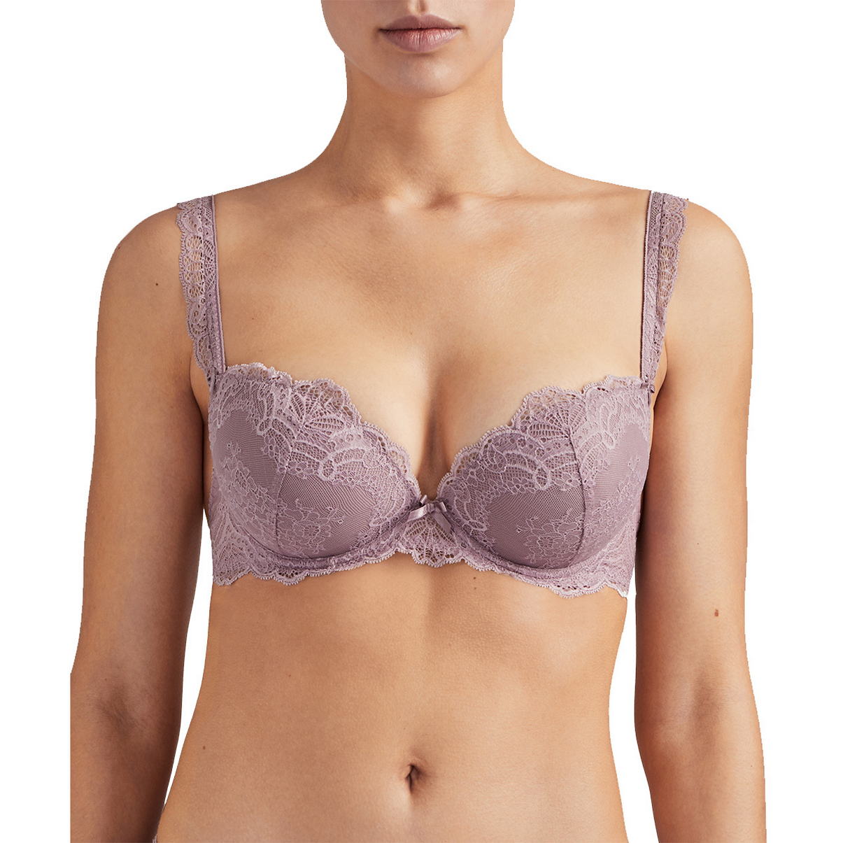 Бюстгальтер - пуш ап з ущільненою формою чашок із прошарком із мусу. Чашки з мусу бежевого кольору, покриті чорним контрастним мереживом з квітковим орнаментом для створення ефекту малюнка на тілі. На центральній панелі розмістився делікатний бантик, ділянка декольте і регульовані бретелі, декоровані мереживною тасьмою.
