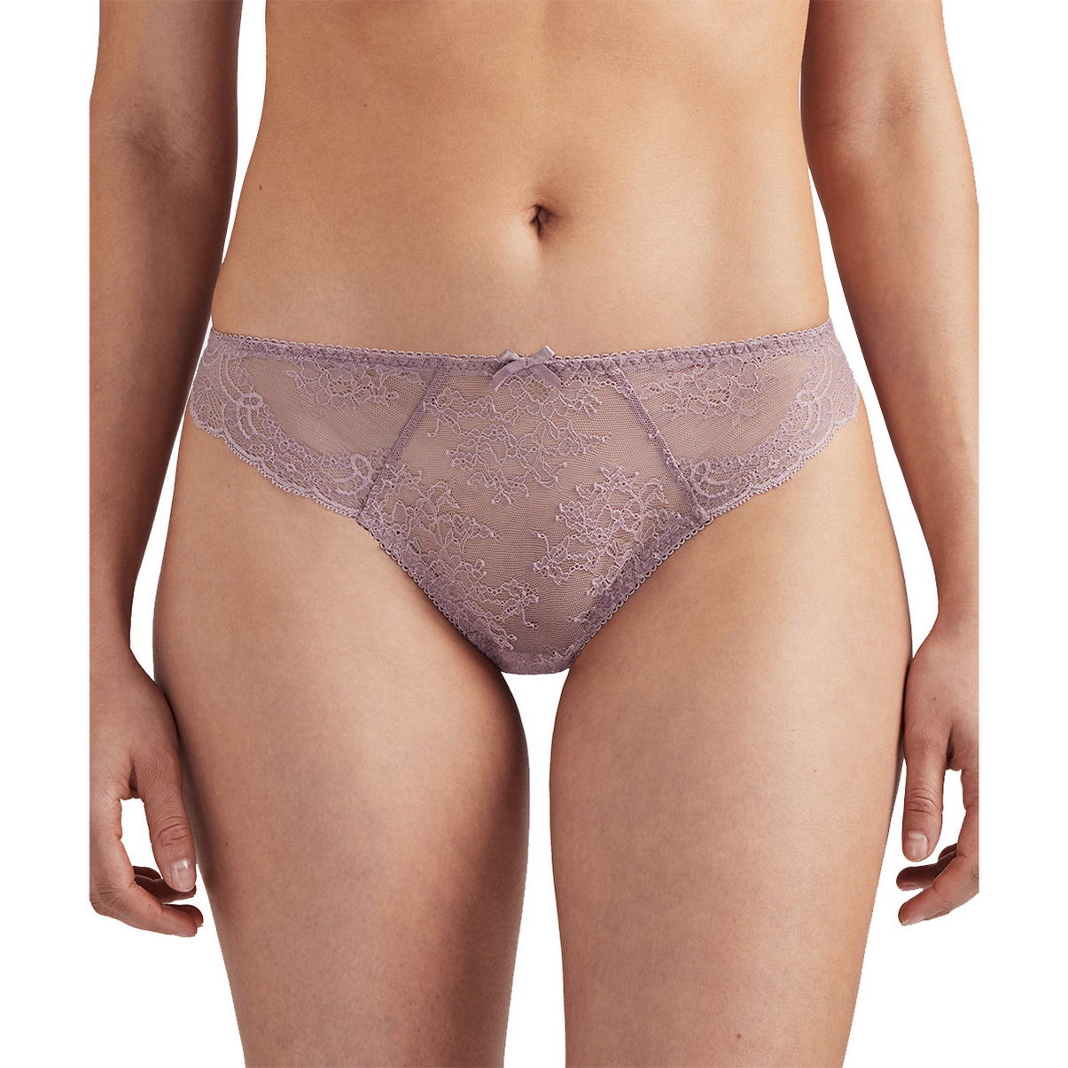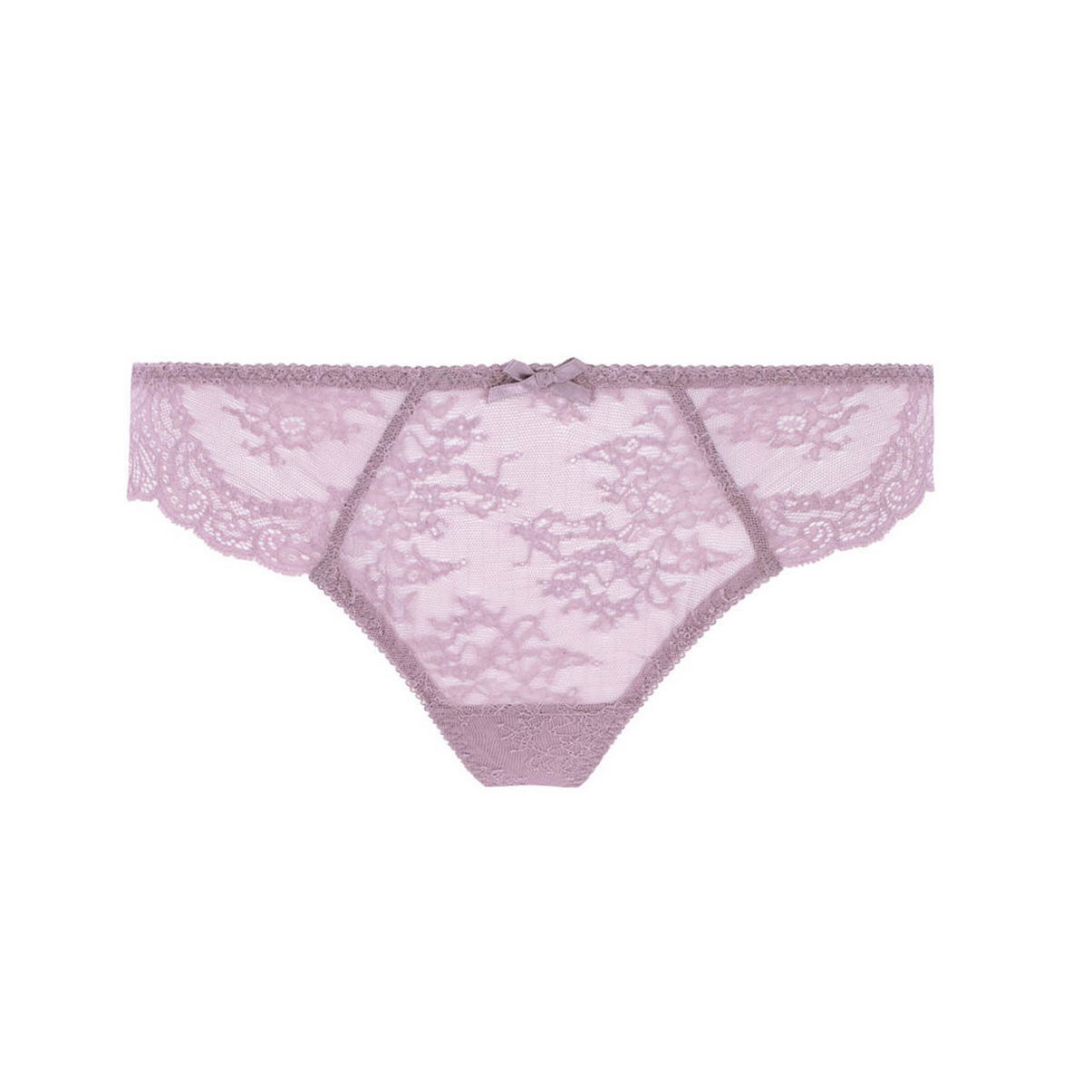 Труси-стрінги із заниженою посадкою повністю виготовлені з мережива з квітковим орнаментом. Верхній край доповнений декоративними зубчиками. На передній та задній панелях розмістився делікатний бантик.