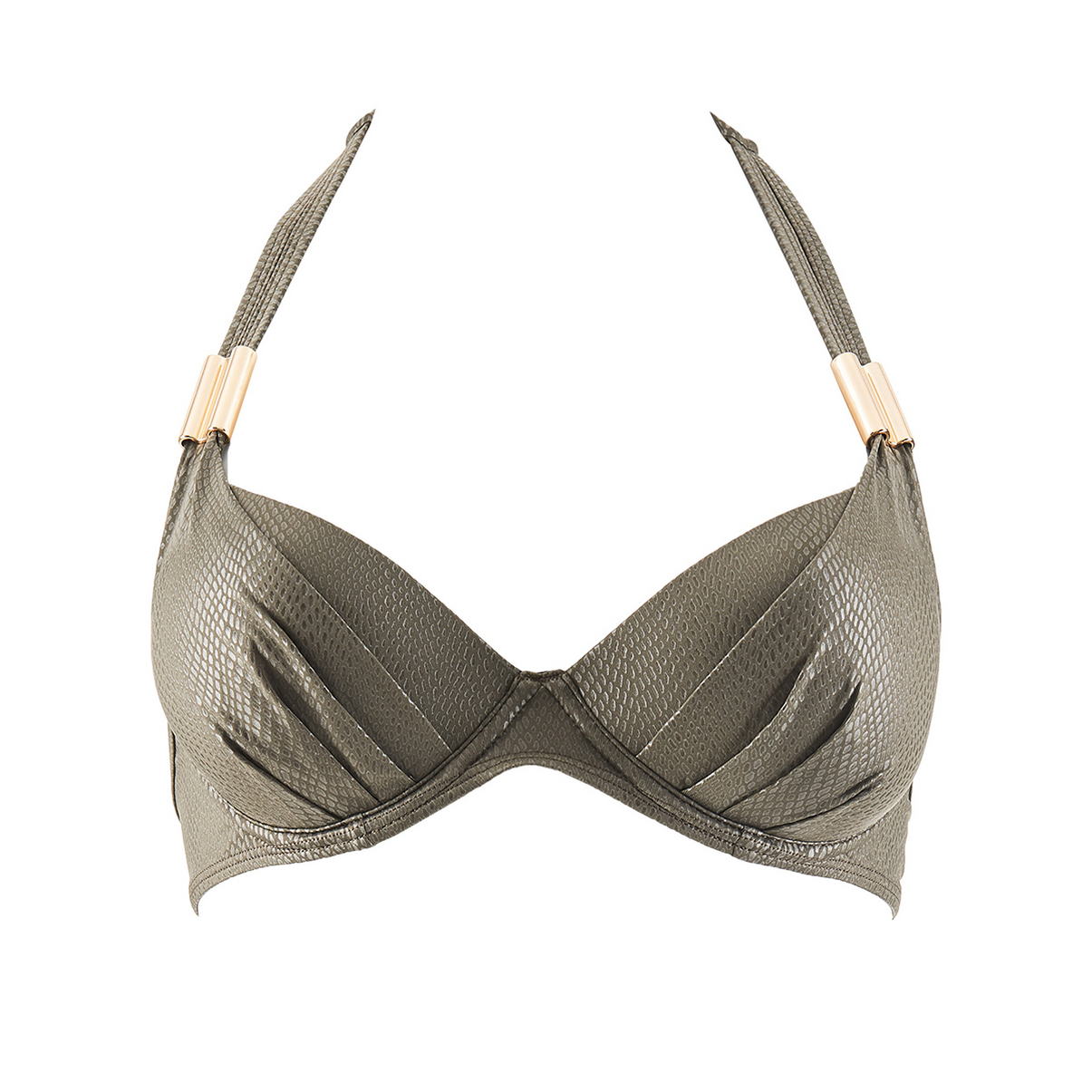 Бюстгальтер-пуш ап із щільною формою чашок з інтегрованими подушками (для надання візуально додаткового обсягу). Бретелі, які зав'язуються навколо шиї, доповнені "золотистими" елементами, застібка ззаду.