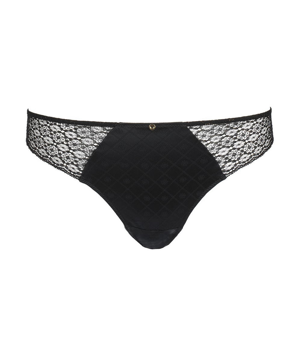 Труси-стрінги із заниженою посадкою. Передня панель виконана із жаккардової атласної тканини. Бічні та задня панелі з мережива "Calais".