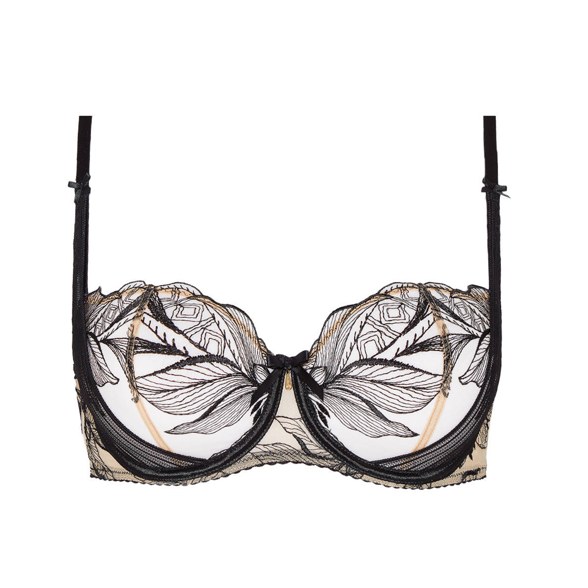 Бюстгальтер-балконет з м'якою відкритою формою чашок на кісточках. Чашки виготовлені з розшитого квітковим орнаментом тюлю, що створює ефект тату на тілі та підкреслює розкіш вишивки. На центральній панелі розмістився бантик із невеликою прикрасою. Регульовані бретелі.