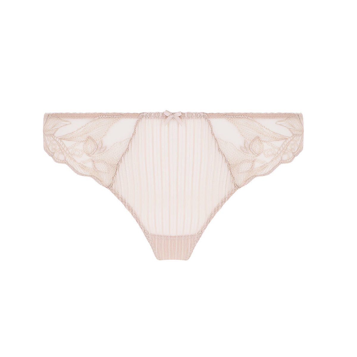Труси-стрінги із середньо-заниженою посадкою. Передня панель виконана з тюлю та декорована вставками з вишивкою з боків. Задня – з тюлю з вишивкою.