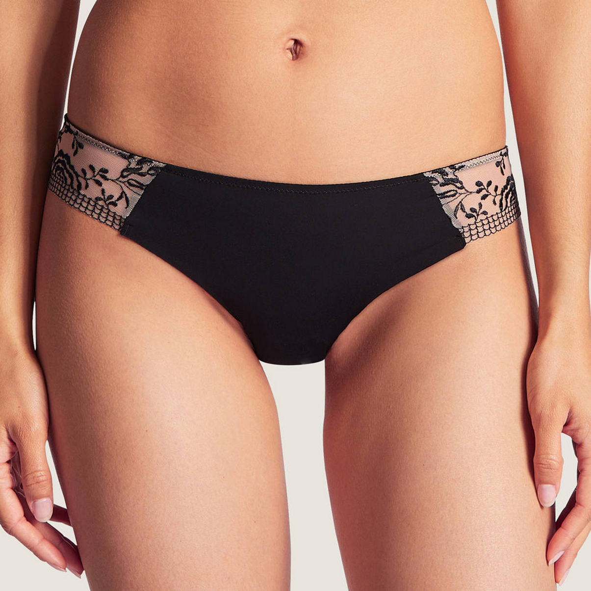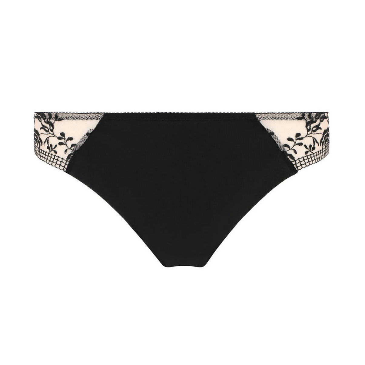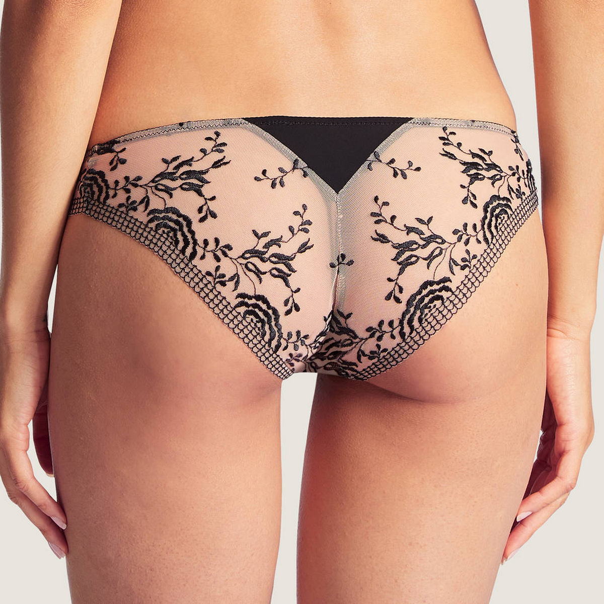 Труси-бікіні із заниженою посадкою. Передня панель виготовлена з непрозорої мікрофібри, бічні та задня панелі – з тюлю з квітковою вишивкою.