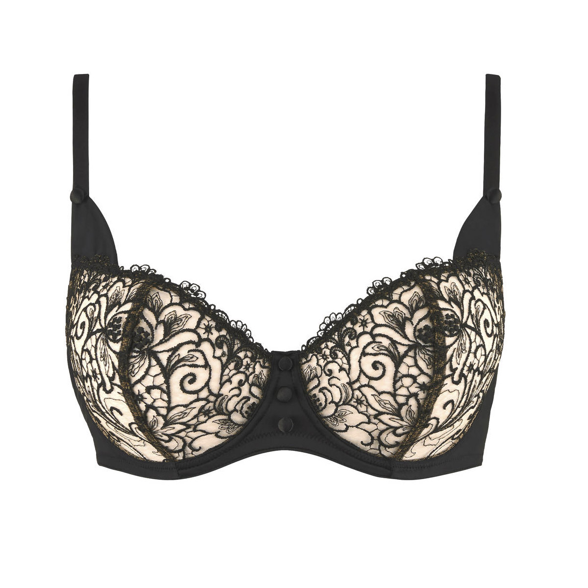 Бюстгальтер - балконет з м'якою досить відкритою формою чашок на кісточках. Чашки виготовлені з вишивки в стилі гіпюр на павутинній основі з контрастного тюлю. Зона декольте доповнена декоративними зубчиками. Основа бюстгальтера та бретелей виконані з атласу та доповнені деталями смокінгу у вигляді атласних ґудзиків. Регульовані бретелі.