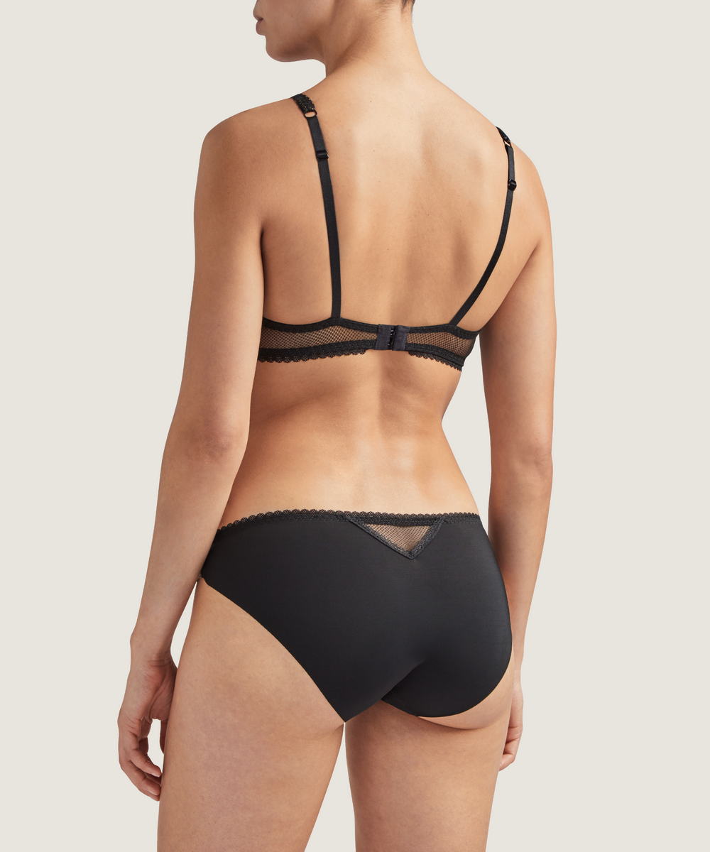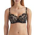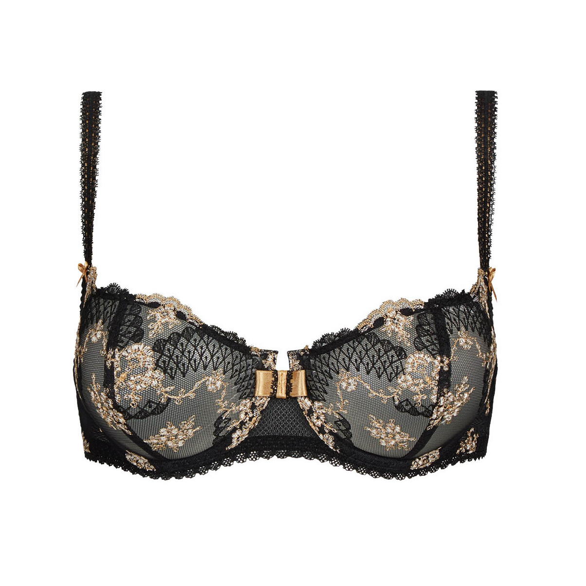 Бюстгальтер - балконет з м'якою відкритою формою чашок на кісточках. Чашки виготовлені з розшитого контрастним кольором тюлю. На центральній панелі розмістився бант. Регульовані, декоровані бретелі.