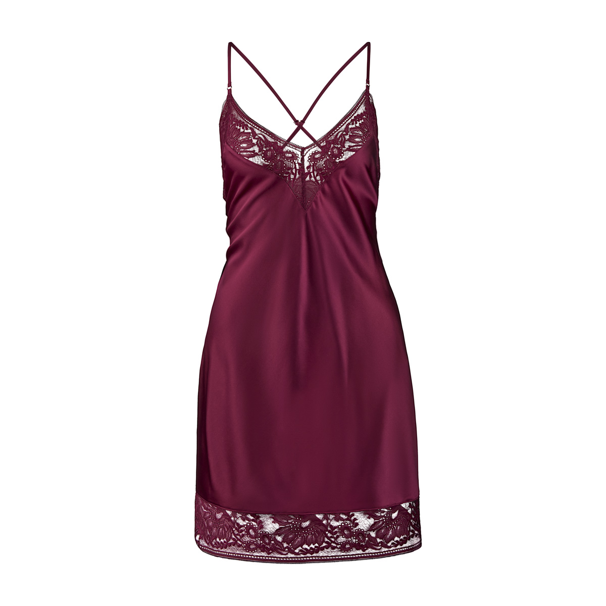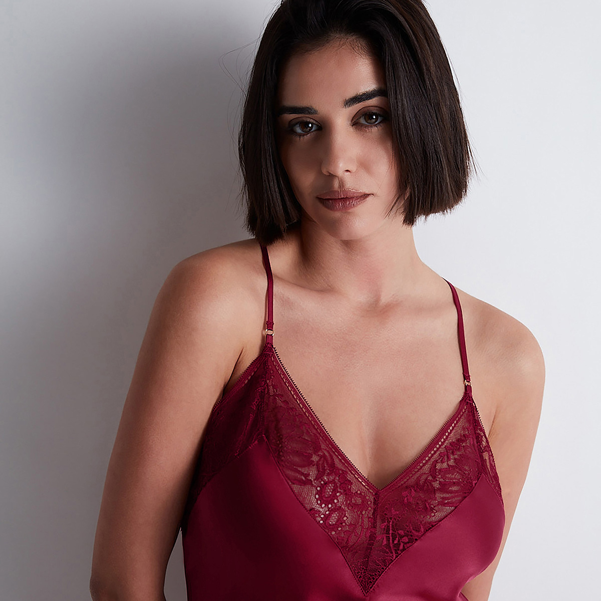 Коротка комбінація вільного крою з V - подібним вирізом на тонких перехресних бретелях, що регулюються. По-верхньому та нижньому краю доповнена розкішним мереживом. Виконана з еластичного шовку.
