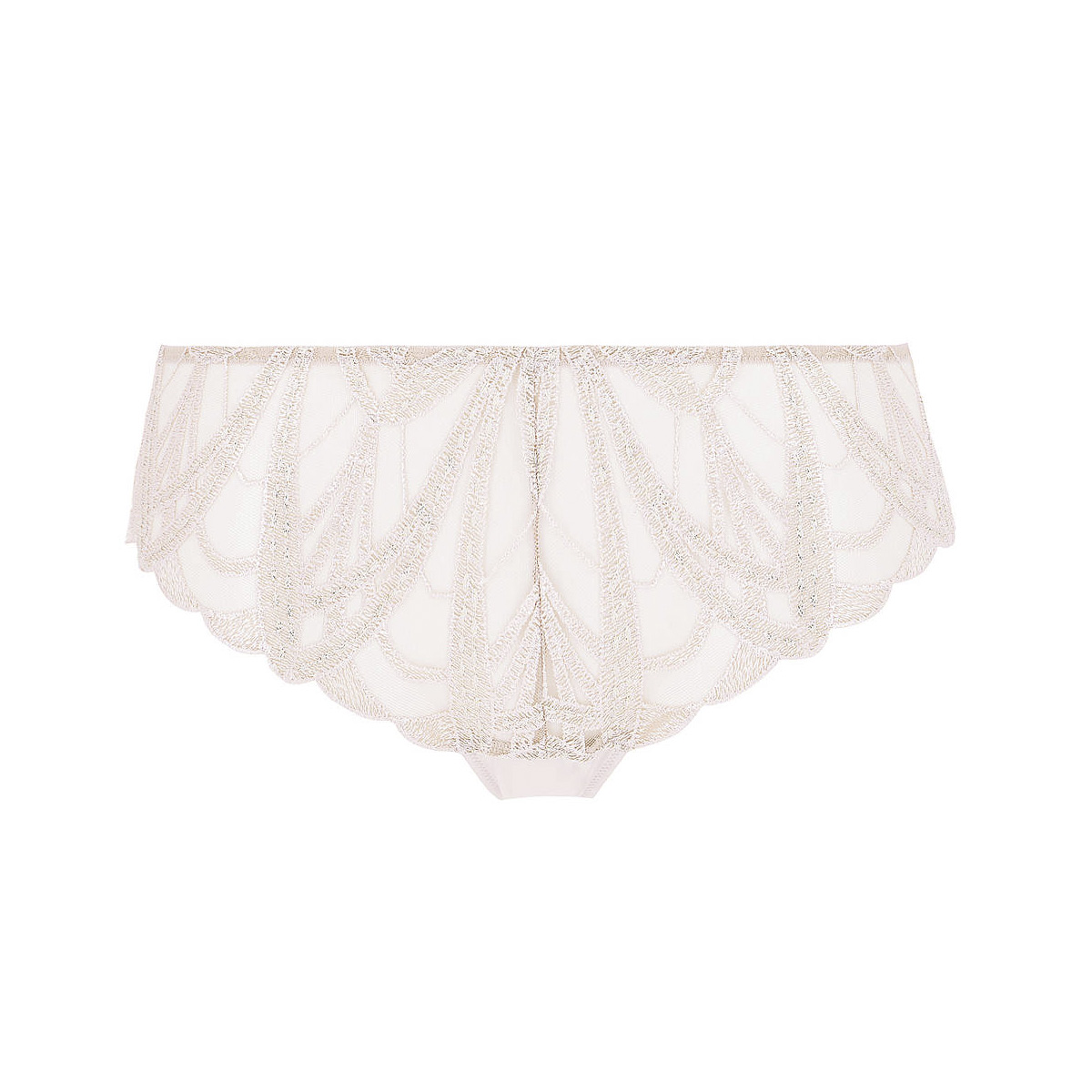 Труси - боксери із середньо - заниженою посадкою. Передня панель виконана з тюля, розшитого французькою вишивкою з вкрапленням люрексу, задня - з тонкої мікрофібри з необробленими краями. Також на задній панелі розмістився металевий аксесуар з логотипом будинку моди Elie Saab.