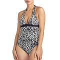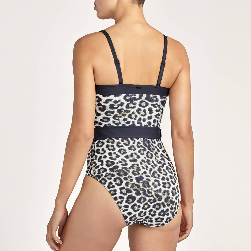 Цільний купальник із ущільненою формою чашок на кісточках. З бретелями, що відстібаються, і знімним поясом. Повністю виготовлений з м'якої, гладкої мікрофібри з набивним малюнком. Верхній край купальника - з контрастним оздобленням. Бічні кісточки.