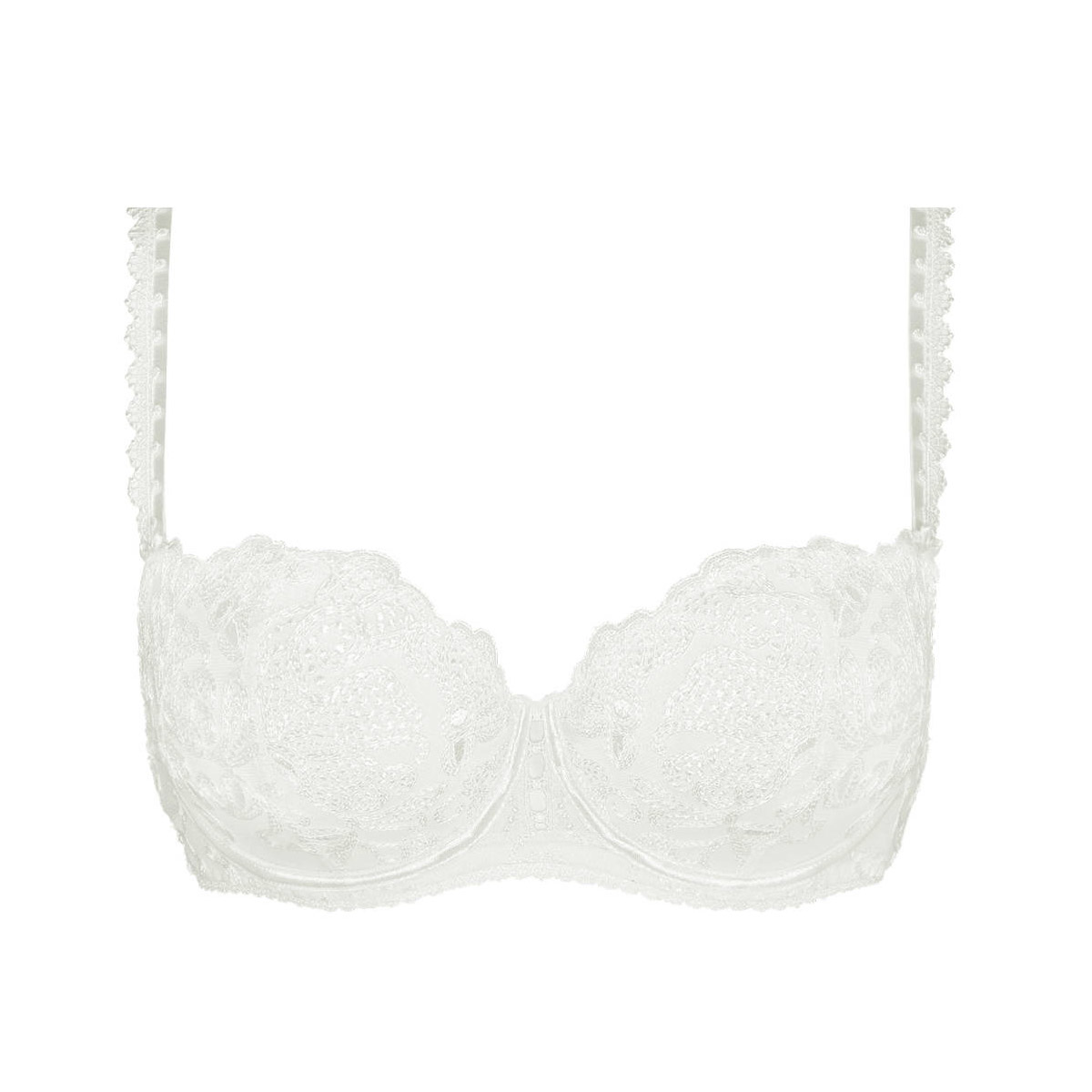 Бюстгальтер-балконет з м'якою відкритою формою чашок на кісточках. Чашки виготовлені з розшитого квітковим орнаментом тюлю, що створює ефект тату на тілі та підкреслює розкіш вишивки. Бретелі, центральна панель та нижній край бюстгальтера декоровані. Регульовані бретелі.