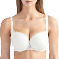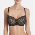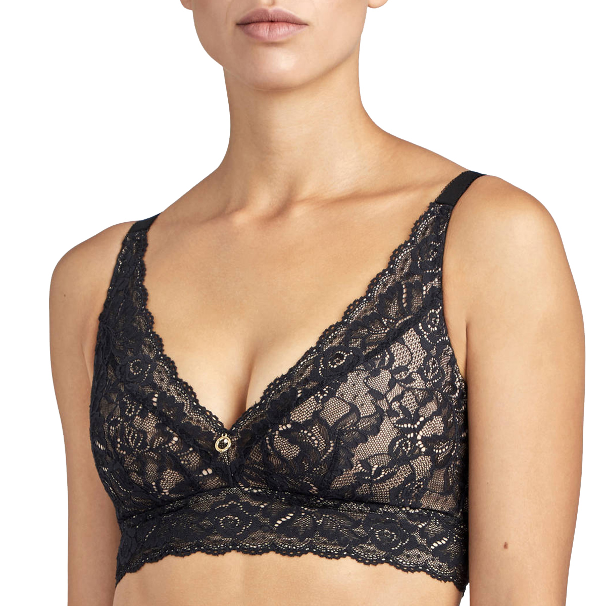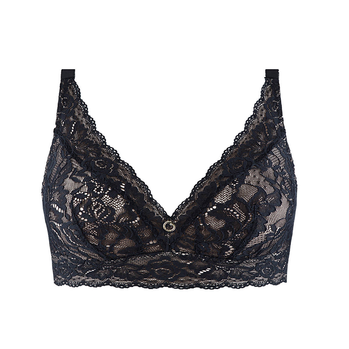 Бюстгальтер - бралет з м'якою трикутною формою чашок, без кісточок. Чашки виготовлені з мережива з квітковим орнаментом і з внутрішньої сторони дубльовані тюлем для надання необхідної підтримки. Область декольте доповнена декоративними зубчиками. На центральній панелі розмістилося маленьке "золоте" колечко зі стразою від "Swarovski". Основа бюстгальтера - мереживна тасьма. Дуже широкі бічні панелі і бретелі, що регулюються.