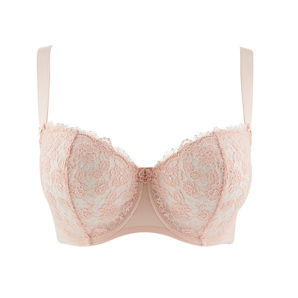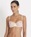 Бюстгальтер-балконет з м'якою відкритою формою чашок на кісточках округляє і припіднімає Ваші груди. Чашки бюсгальтера повністю виготовлені з гіпюру кольору перлини, делікатно відтінений золотою ниткою, завдяки якій створюється ефект тату. Чашки бюстгальтера дубльовані тюлем. Ділянка декольте доповнена декоративними зубчиками. Глибоке та спокусливе декольте Вам гарантовано! Регульовані бретелі, основи яких декоровані бантиками. Бічні панелі із мікрофібри.