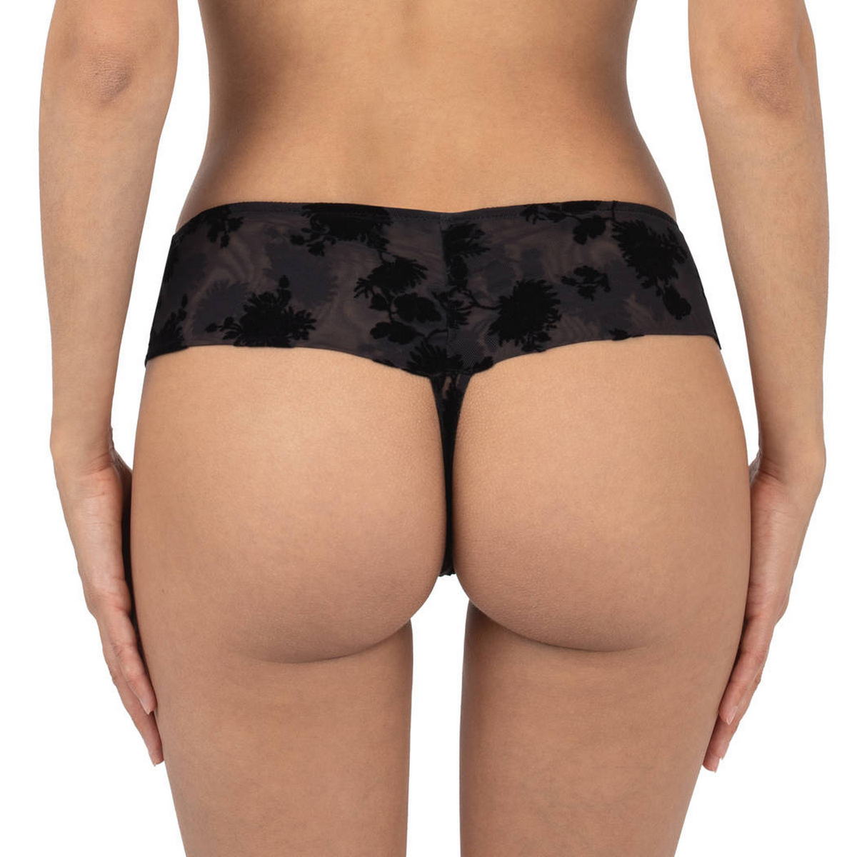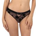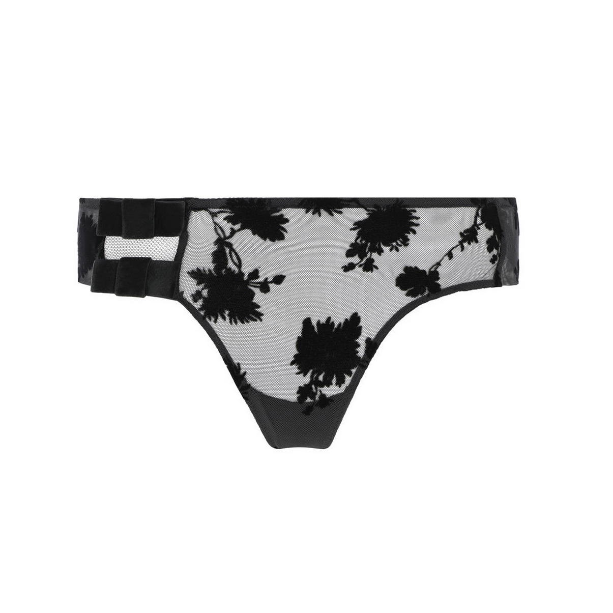 Трусики у формі боксери-стрінги з широким стегном із середньозаниженою посадкою виконані з прозорого тюлю. На передній панелі праворуч вставка з сітчастої тканини з двома атласними бантиками, а задня панель з призібраним швом посередині - з подвійного тюлю, підвернутого знизу, що робить край дуже комфортним і абсолютно невидимим під одягом.