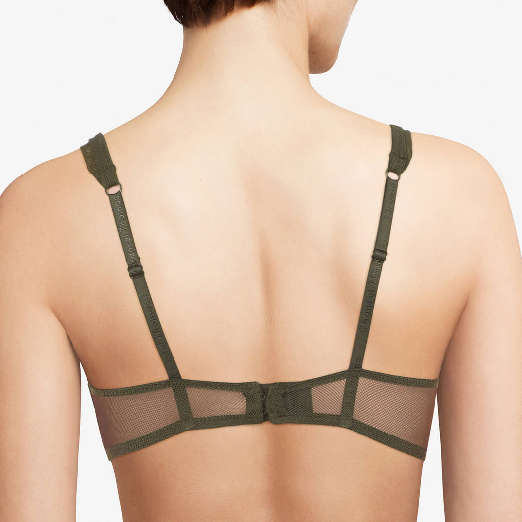 М'який бюстгальтер на кісточках. Чашки дубльовані тюлем для кращої підтримки. Крій складок імітує орігамі, бретелі з тюлю з плісуванням у вигляді орігамі, а також логотипом "Chantal Thomass" ззаду. Додаткова бічна кісточка.