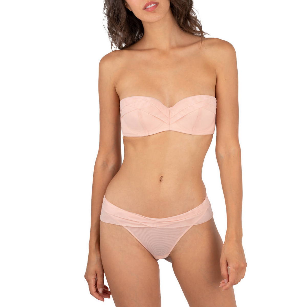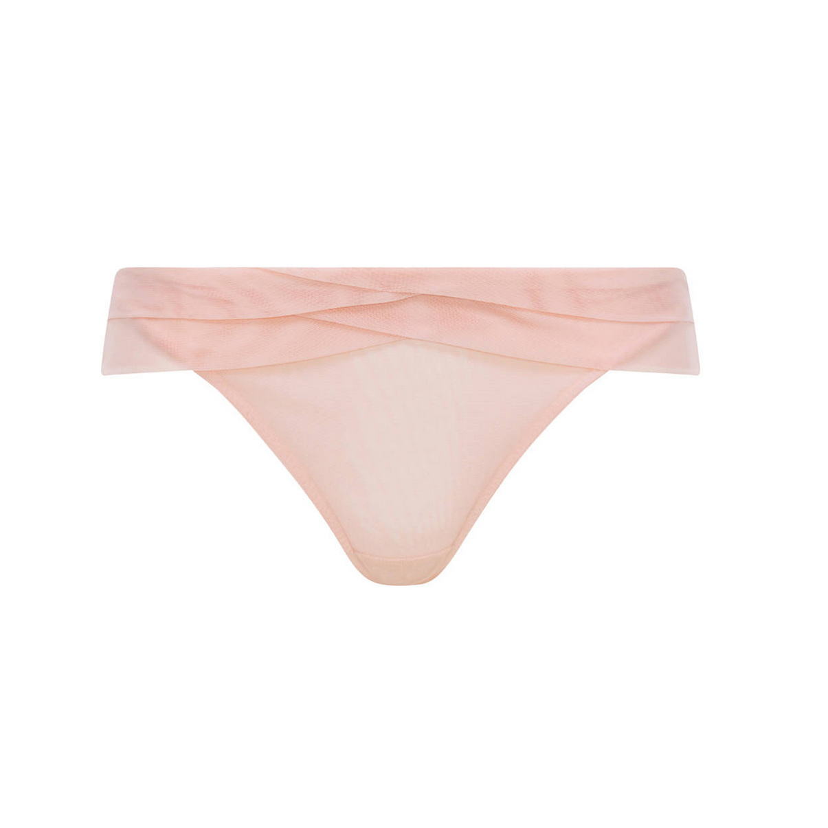 Середньо занижена форма трусиків-стрінгів. Крій складок імітує орігамі, дубльовані тюлем на передній панелі, вузька задня панель прикрита подвійною тюльовою пелеринкою. Бавовняна ластовиця.