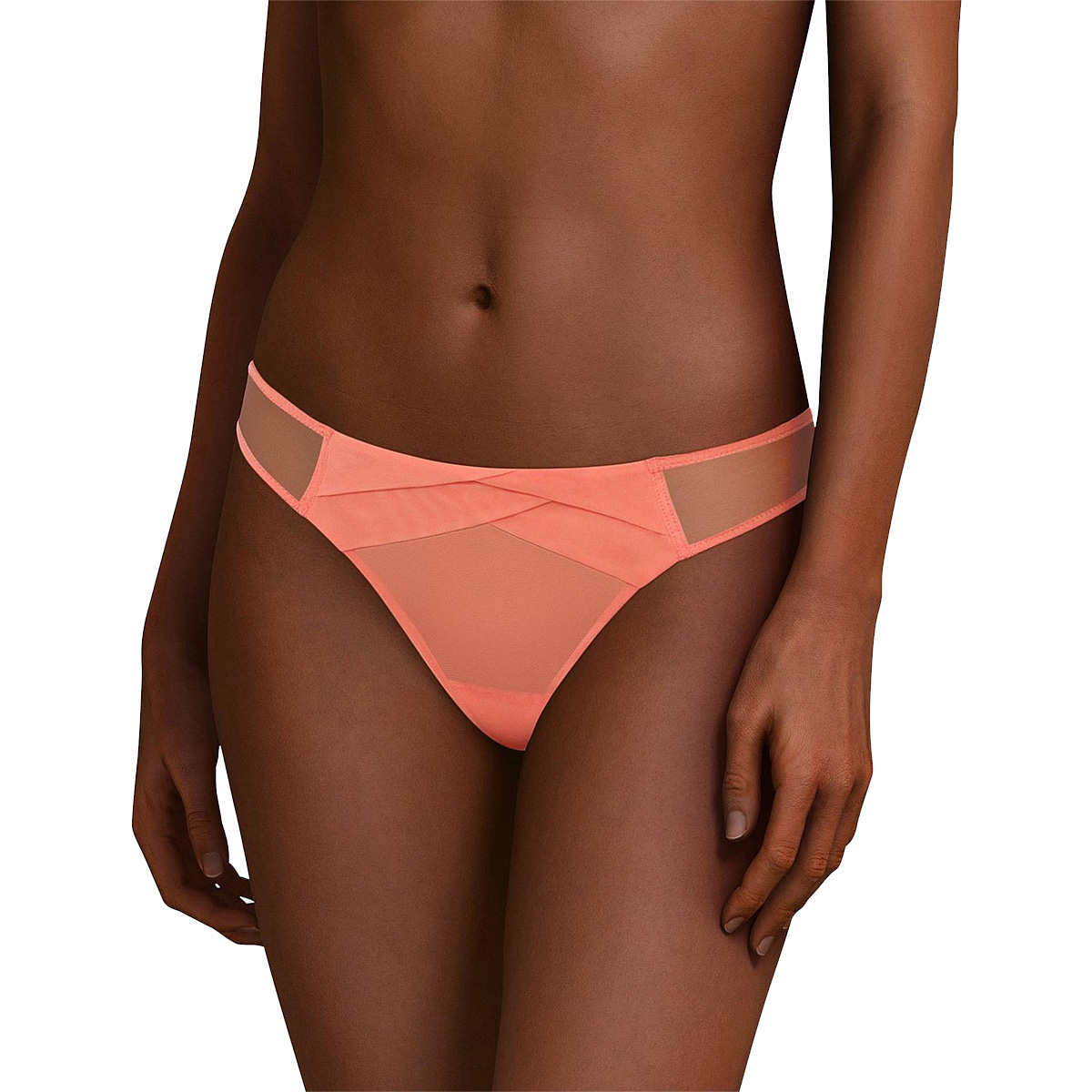 Труси-стрінги оновленої форми із середньо-заниженою посадкою. Передня панель дубльована, щоб уникнути прозорості, і декорована елементом орігамі. Задня панель – з прозорого тюлю.