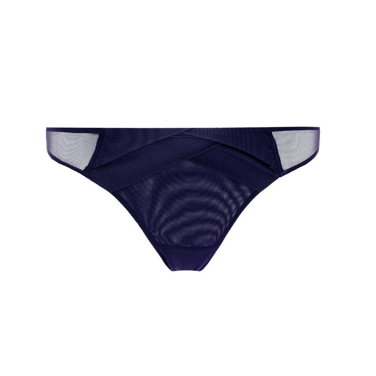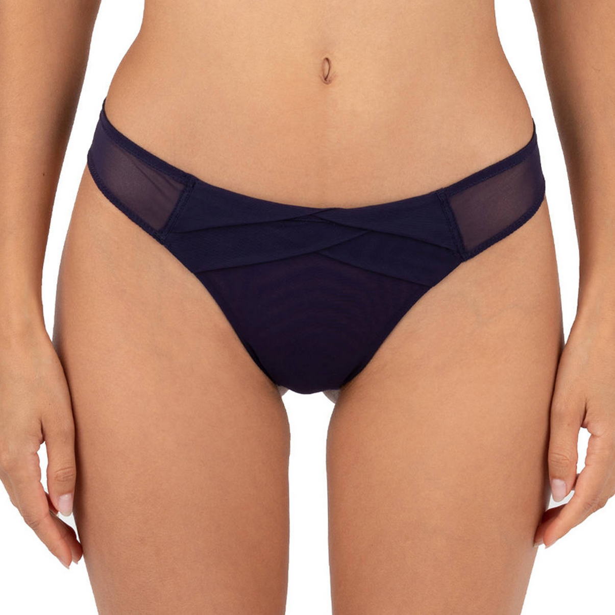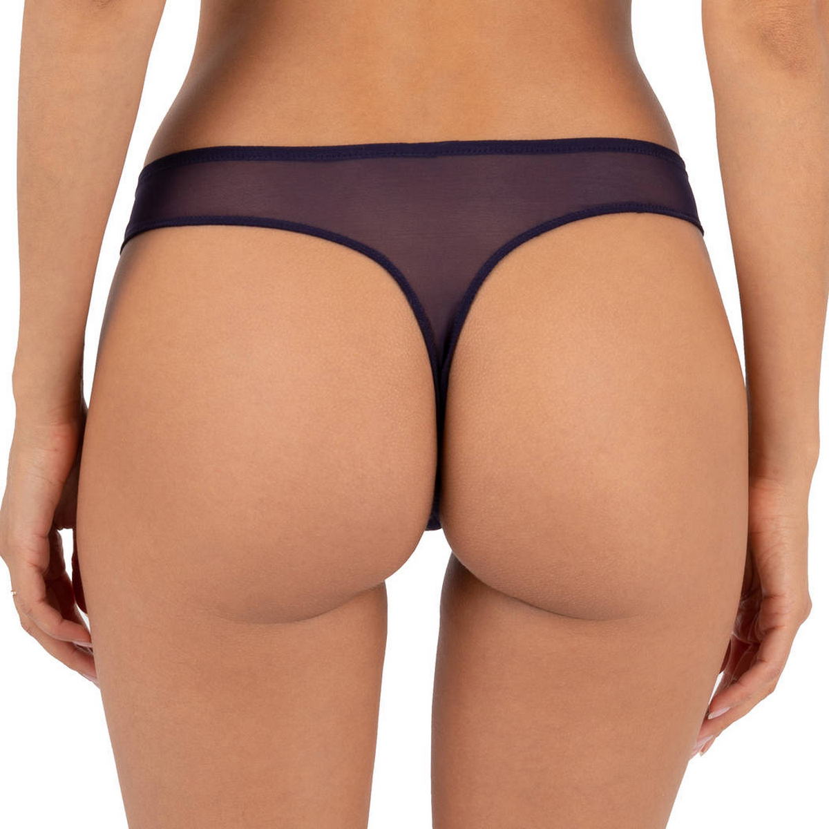 Труси-стрінги оновленої форми із середньо-заниженою посадкою. Передня панель дубльована, щоб уникнути прозорості, і декорована елементом орігамі. Задня панель – з прозорого тюлю.