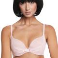 Бюстгальтер - бандо з інтегрованими подушками з мусу для надання візуально додаткового обсягу; на кісточках. Чашки покриті еластичним тюлем, у нижній частині - доповнені драпіруванням та бантом. Бічні панелі дубльовані та оснащені силіконовими доріжками для забезпечення необхідної підтримки. Регульовані бретелі, що відстібаються.
