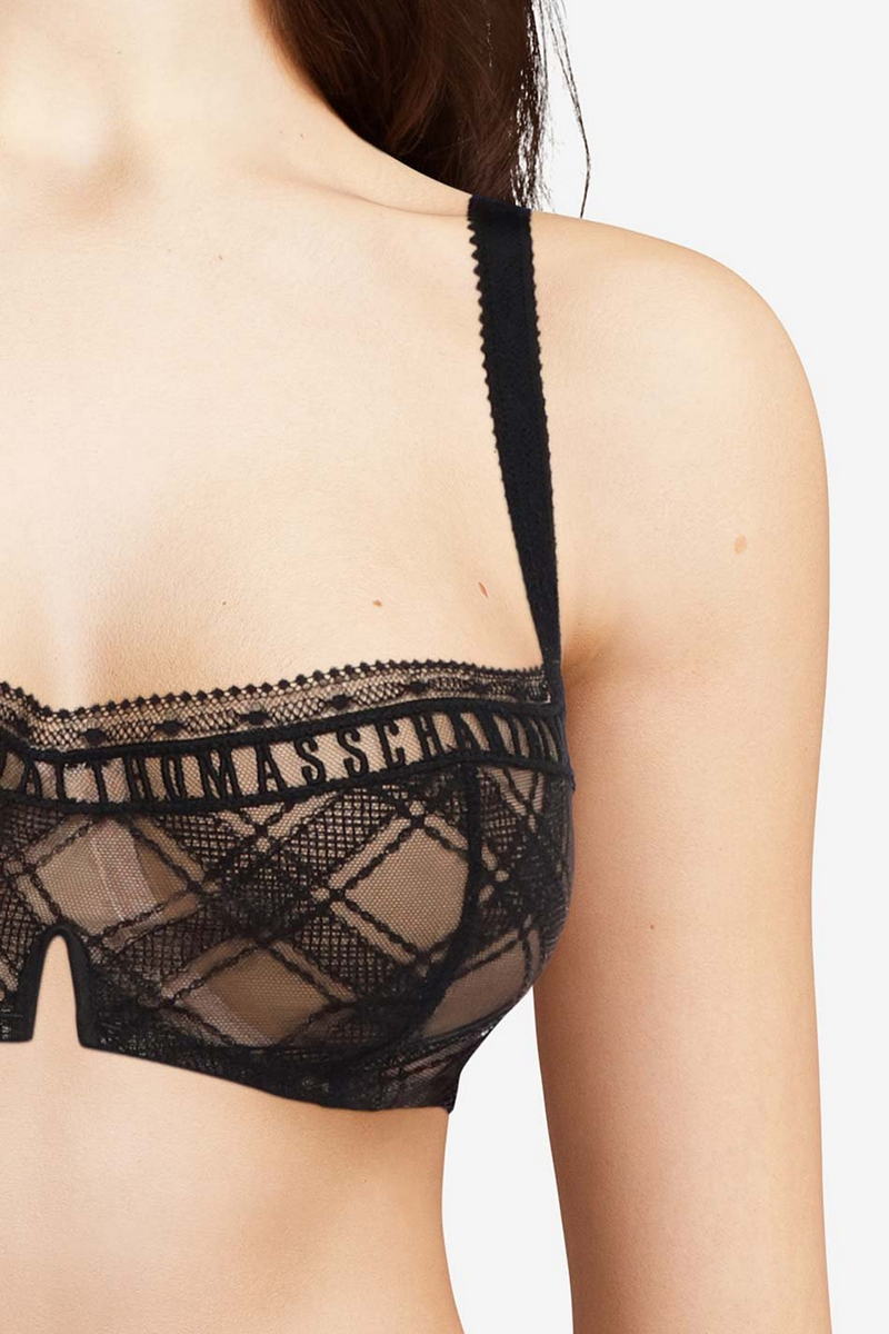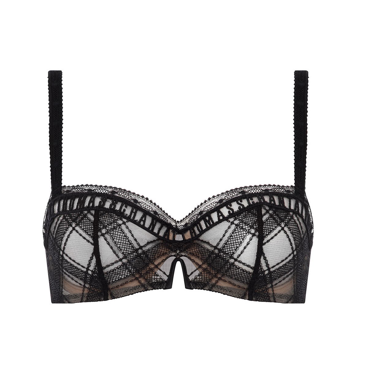 Бюстгальтер-балконет з м'якою формою чашок на кісточках. Чашки виконані з прозорого тюлю, який декорований вишивкою (квітковим орнаментом або візерунком тартан). Ділянка декольте прикрашена вишитими ініціалами "Chantal Thomass", що асоціюється з дотиком руки Майстра. Бічні панелі – з прозорого тюлю. Регульовані бретелі.