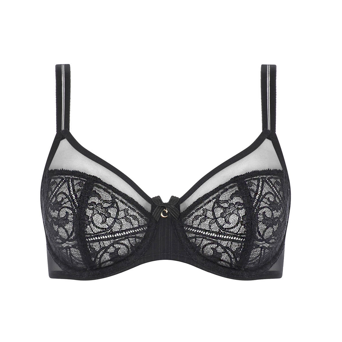 Бюстгальтер – класичний з м'якою закритою формою чашок; на кісточках. Чашки виконані з мережива Leavers; з внутрішньої сторони дубльовані тюлем для надання необхідної підтримки; у верхній частині доповнені прозорим тюлем. Бічні панелі виготовлені з тюлю. Балетна спинка для збалансованого розподілу тиску. Декоративні бретелі, що регулюються. На центральній панелі – декоративна деталь з логотипом та невеликим бантиком.