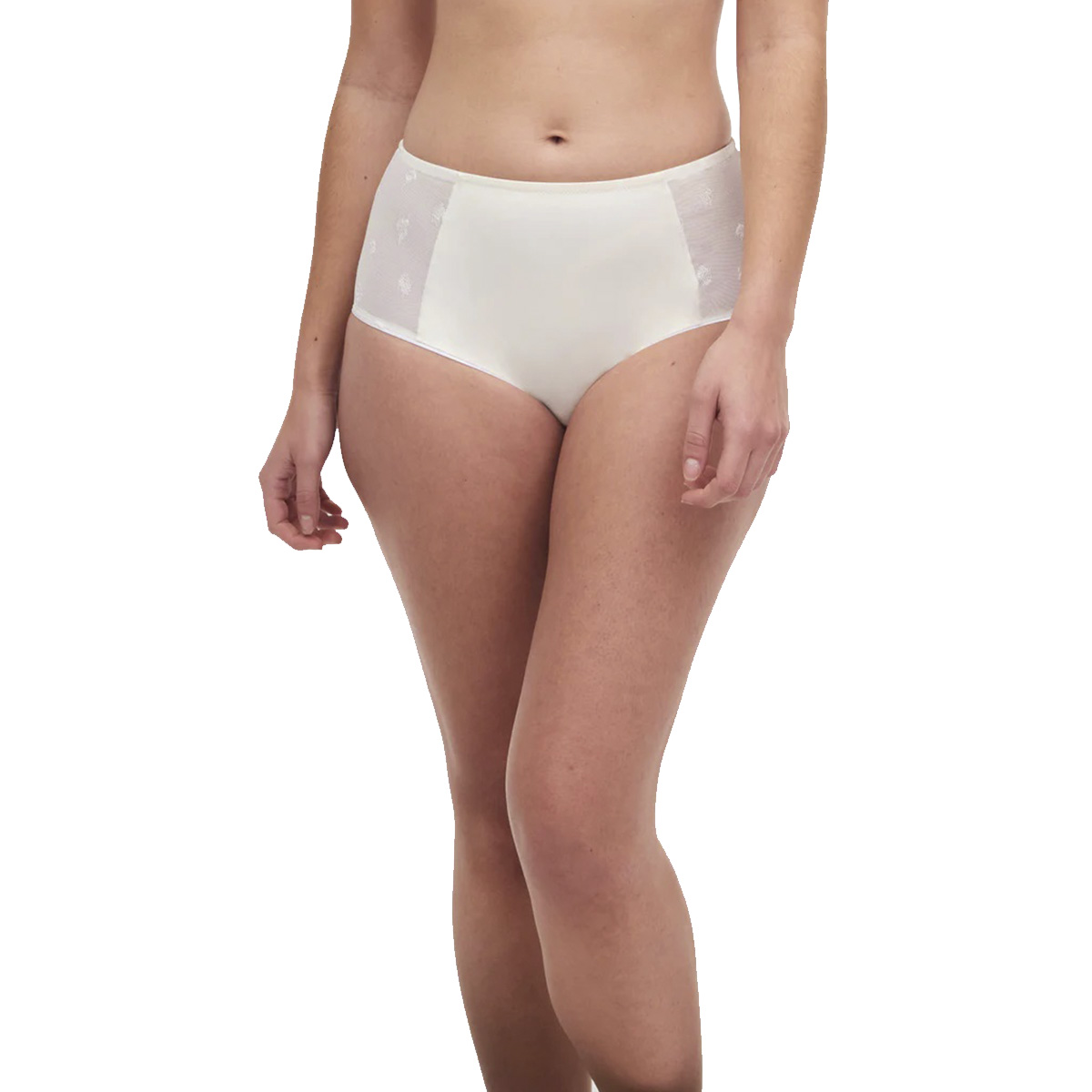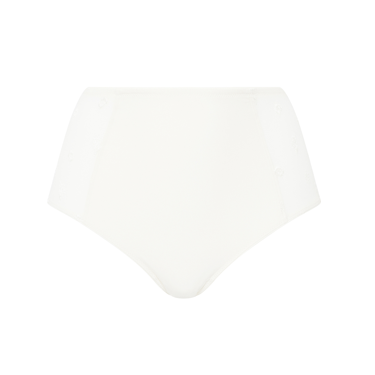 Труси з високою талією з високою посадкою. Повністю виконані з м'якої мікрофібри, з боків декоровані розшитим тюлем. Передня панель дубльована для невеликого коригуючого ефекту.