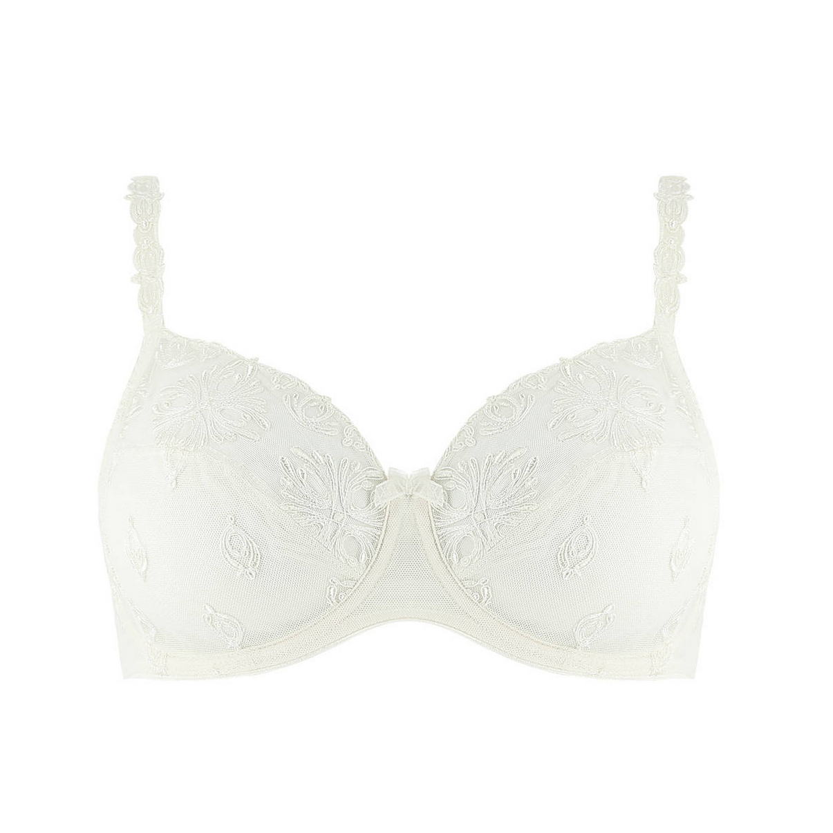 М'який закритий бюстгальтер на кісточках з 3-х частин, що забезпечує посилену підтримку грудей та комфорт. Виконаний з тюлю з чудовою об'ємною багатобарвною вишивкою. Нижня частина чашки дубльована. Декоративна бретель із вишивкою. Між чашками - ніжний бантик, овальна спинка.