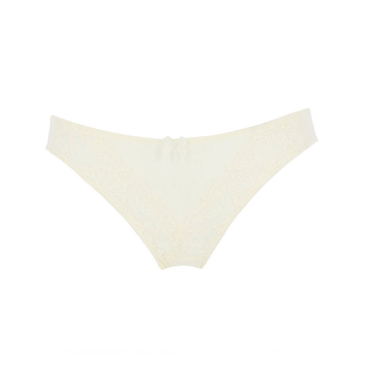 Закриті трусики з ніжним бантиком на талії спереду. Передня панель дубльована та виконана з тюлю з чудовою об'ємною багатобарвною вишивкою. Задня панель із непрозорої мікрофібри, бавовняна ластовиця.