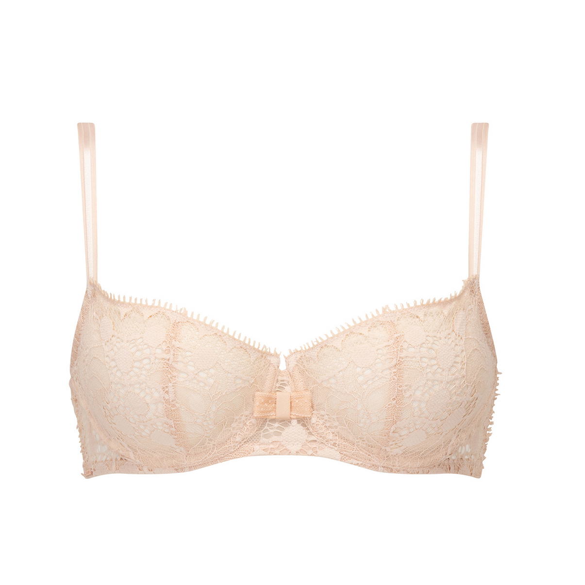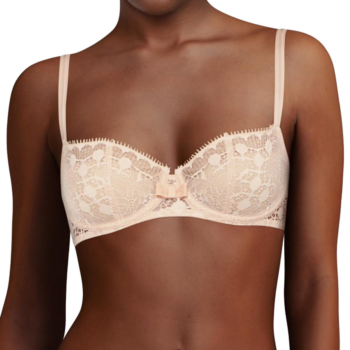 Бюстгальтер - балконет з м'якою відкритою формою чашок на кісточках. Чашки бюстгальтера виготовлені з мережива з квітковим орнаментом. На центральній панелі - бант. Область декольте доповнена декоративними зубчиками. Регульовані бретелі.