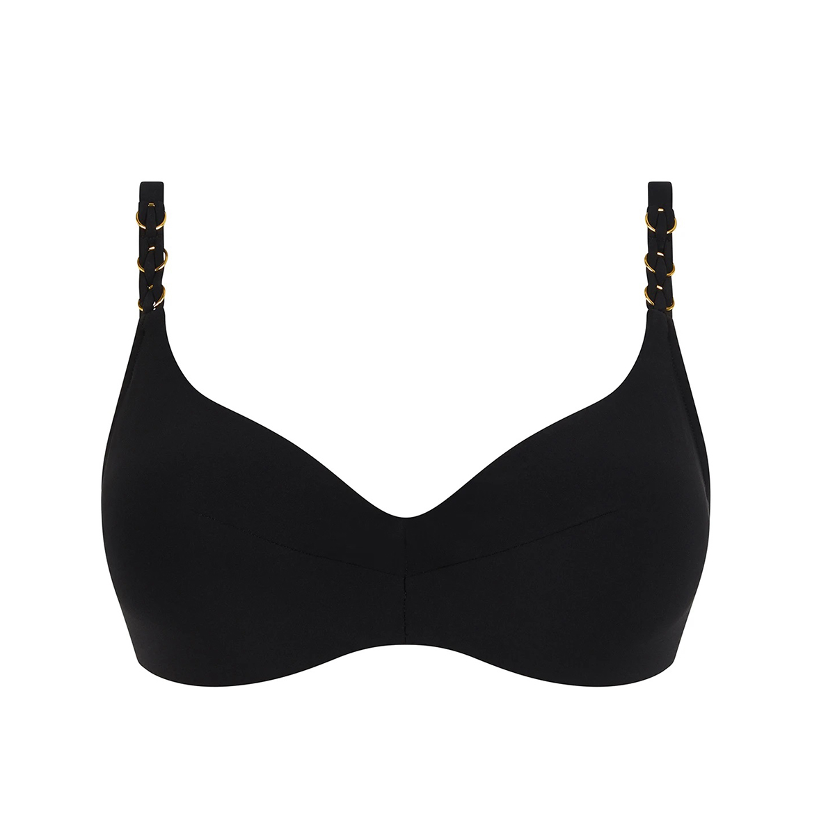 Бюстгальтер - класичний з м'якою, достатньо закритою формою чашок на кісточках. Чашки з внутрішньої сторони дубльовані тюлем для додаткової підтримки. Регулюючі бретелі доповнені декоративним плетенням та золотими кільцями. Застібка ззаду.
