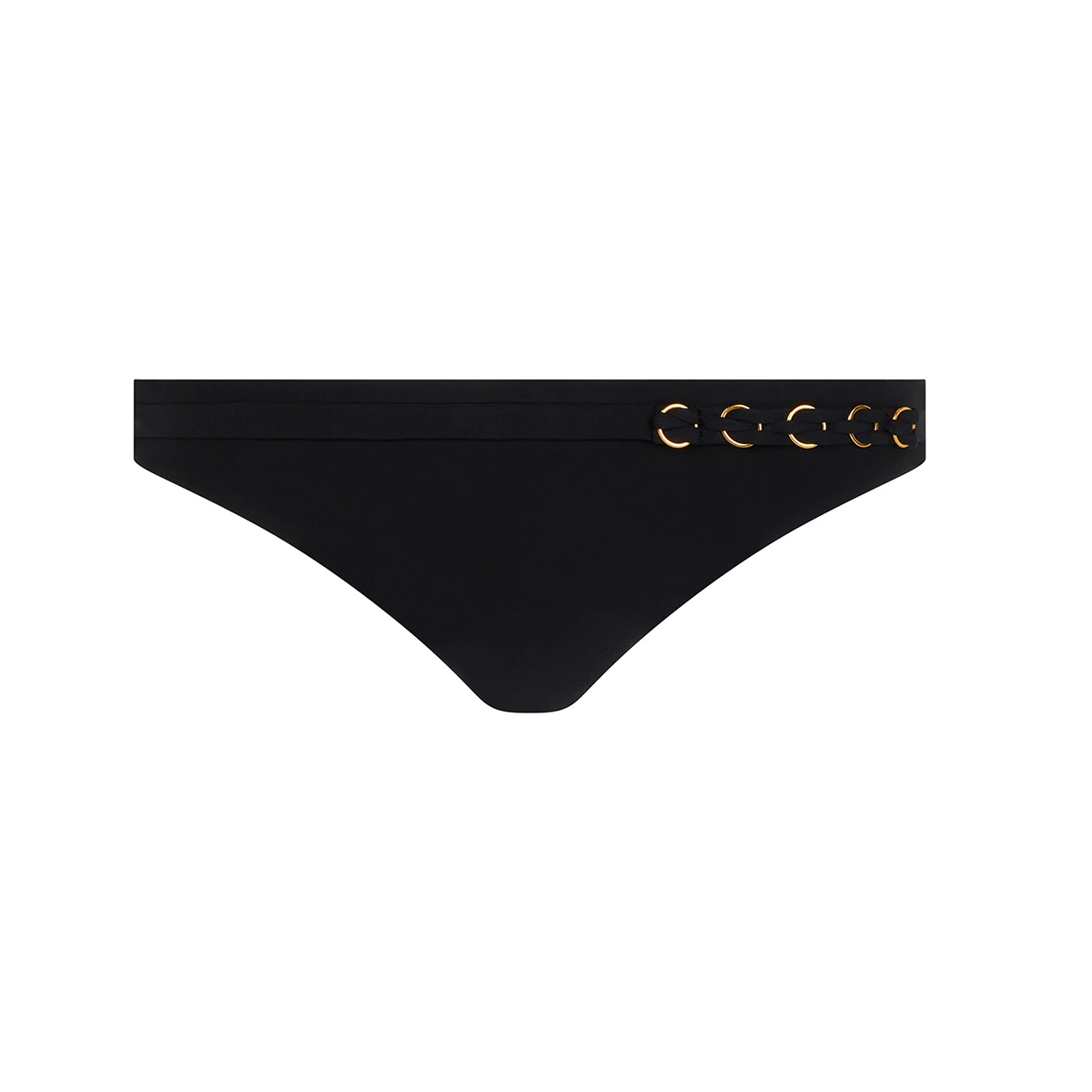 Труси – класичні із середньо-заниженою посадкою. Повністю дубльовані для уникнення прозорості. Передня панель асиметрично доповнена золотими кільцями.