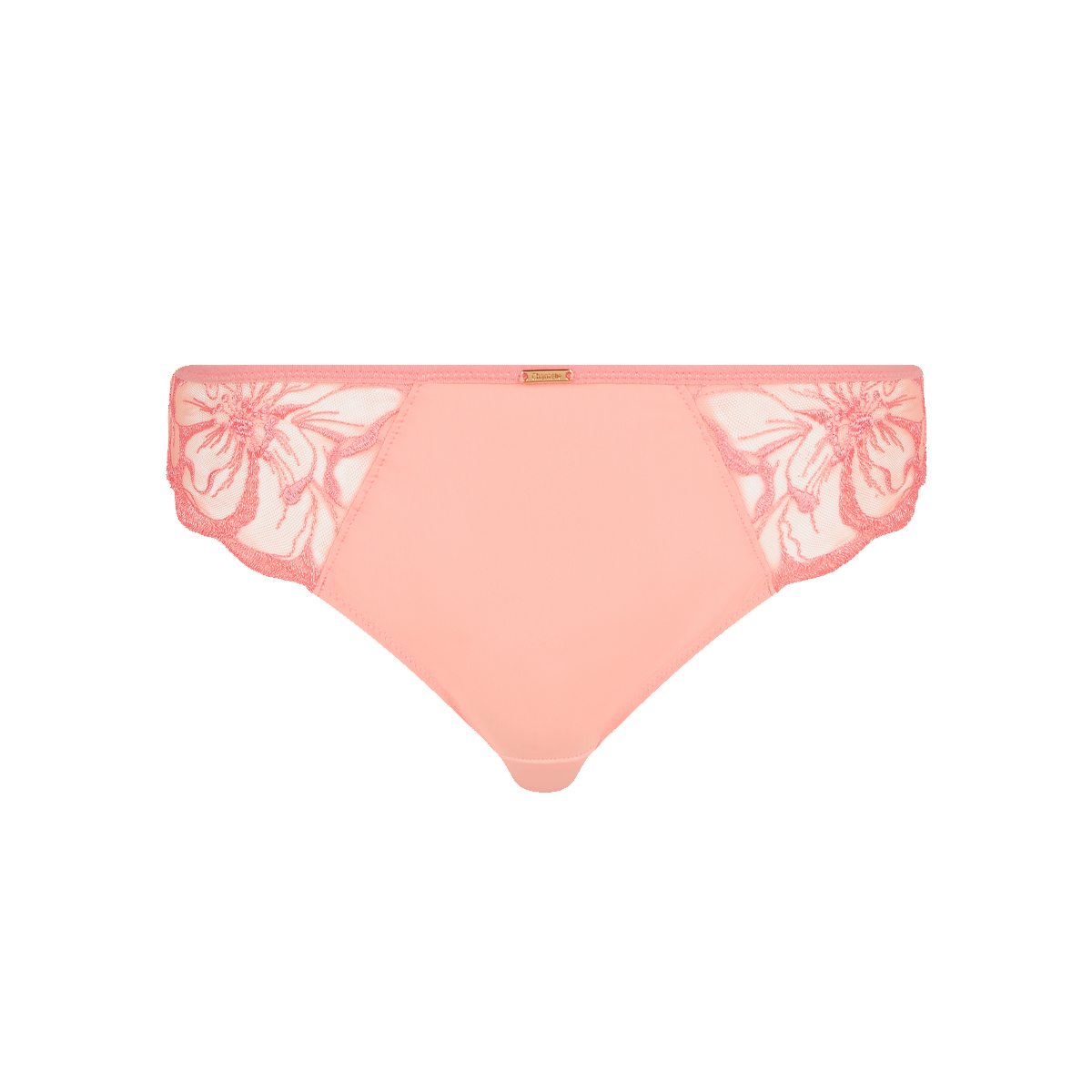Труси – класичні із середньо-заниженою посадкою. Майже повністю, виконані з непрозорої мікрофібри. Бічні панелі доповнені розшитим квітковим орнаментом тюлем. Центральна панель доповнена "золотим" аксесуаром із логотипом бренду.