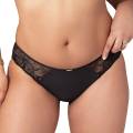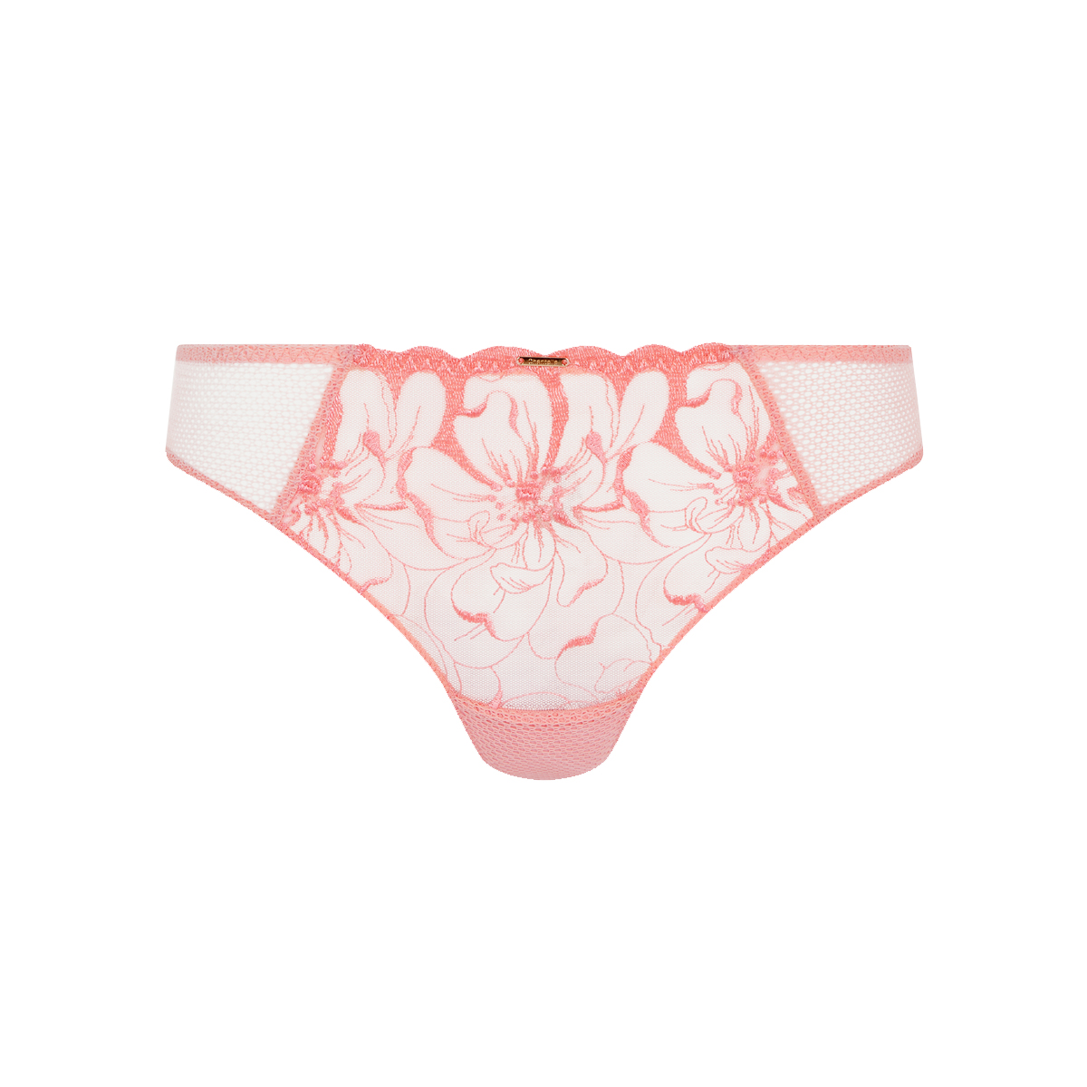 Труси – стрінги із середньо-заниженою посадкою. Майже повністю, виконані з розшитого квітковим орнаментом тюлю. Бічні панелі – із сітки. Передня панель доповнена "золотим" аксесуаром із логотипом бренду.