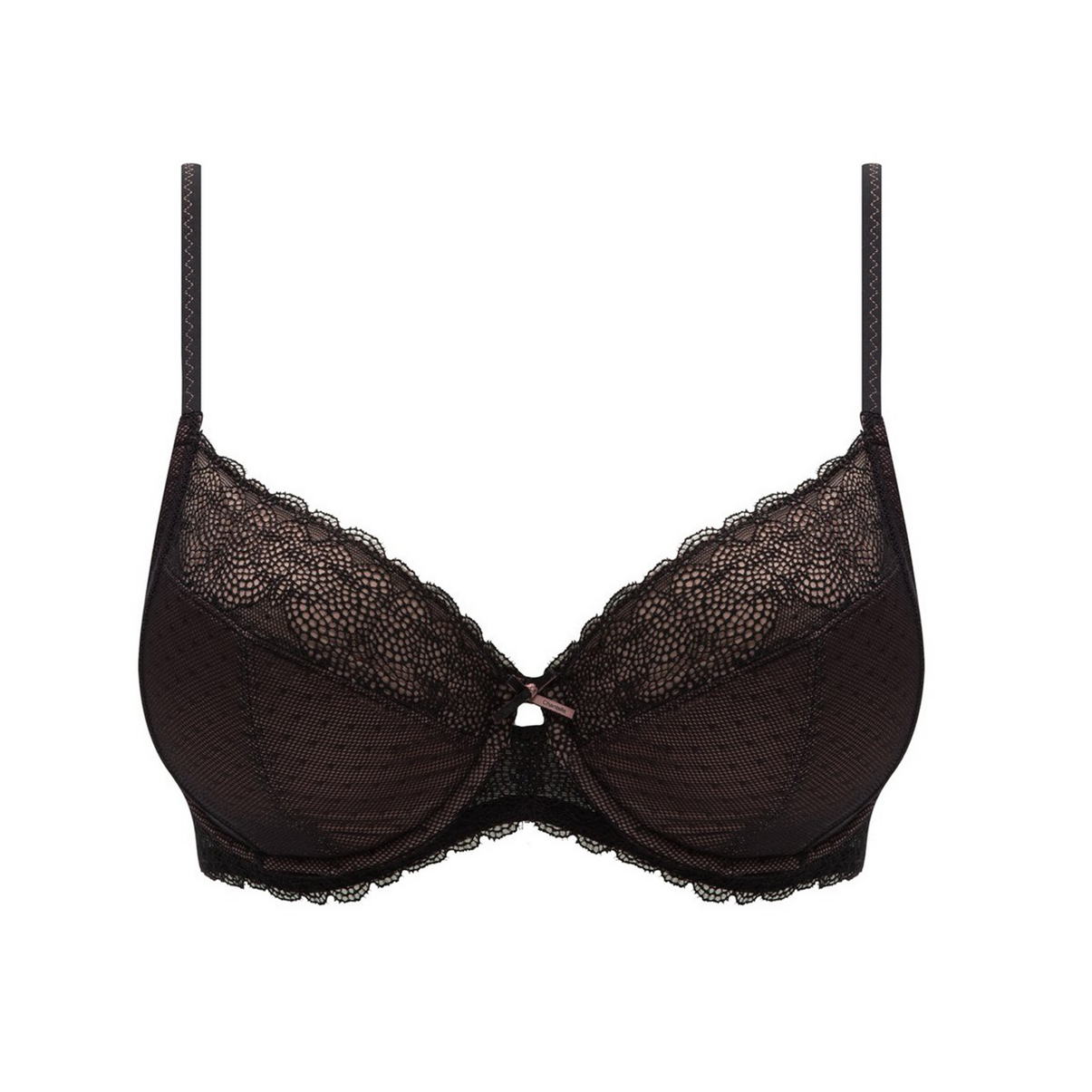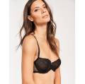 Бюстгальтер класичний на кісточках з м'якою закритою формою чашок, що складається з 4 частин. Чашки виконані з тюлю в горошок, з внутрішнього боку дубльовані для надання необхідної підтримки, по-верхньому краю декоровані мереживом. Основа та бічні панелі бюстгальтера виконані з плоского мережива. Центральна панель декорована бантиком. Регульовані бретелі.