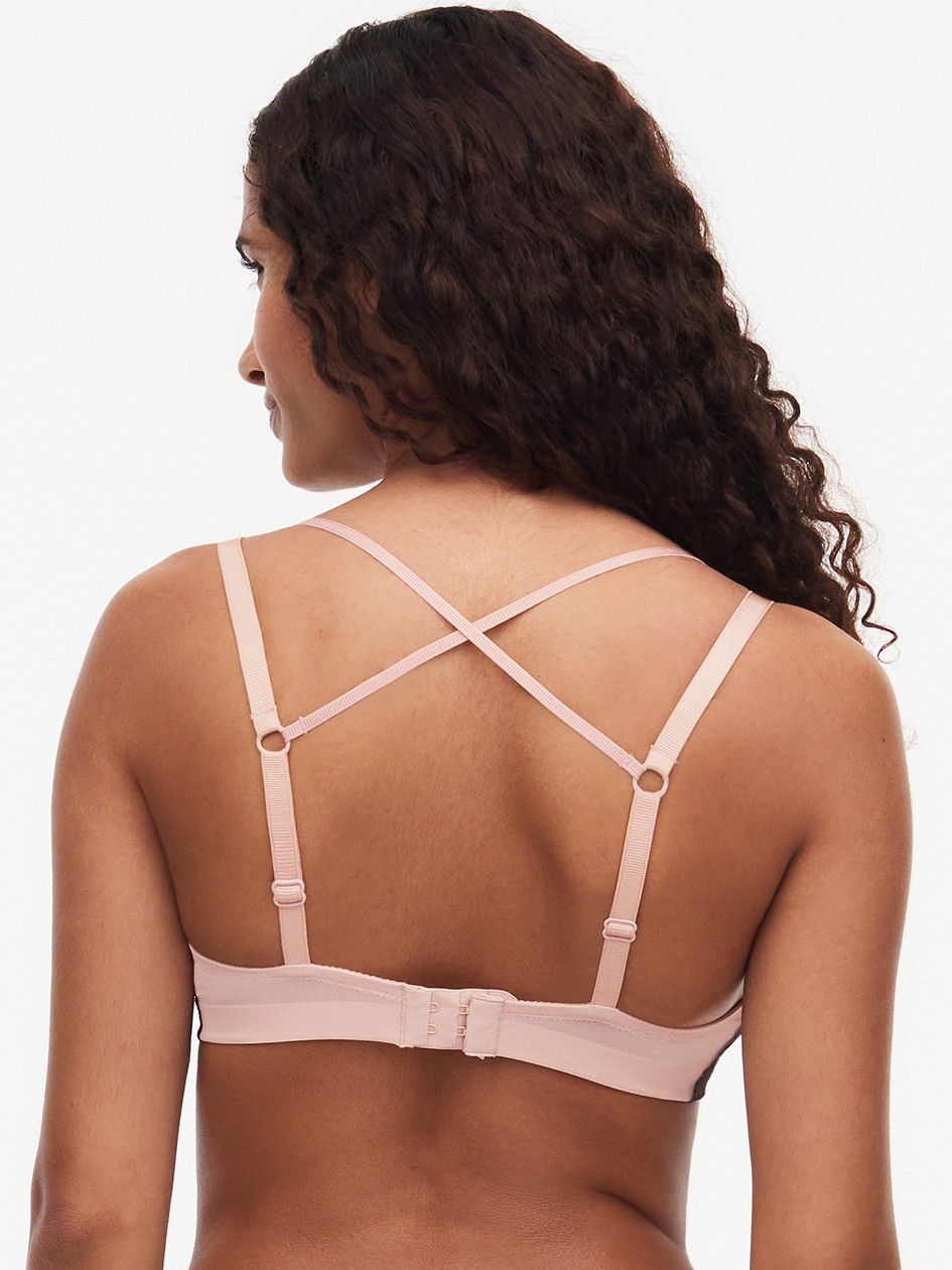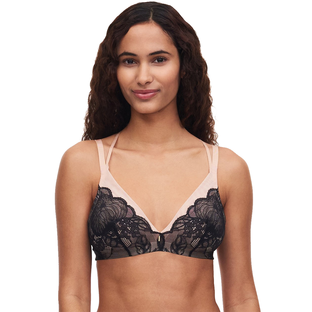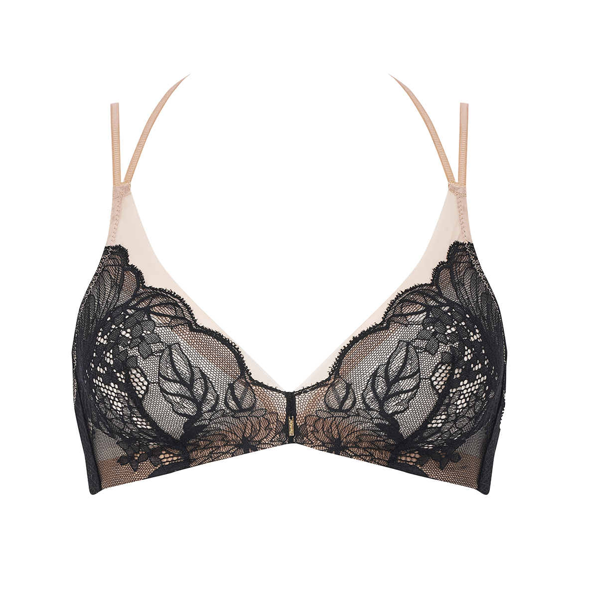 Бюстгальтер – бралет з м'якою трикутною формою чашок без кісточок. Чашки виконані з бежевого тюлю та покриті контрастним чорним мереживом із квітковим орнаментом. Основа бюстгальтера – широка еластична тасьма – для надання додаткової підтримки. Бічні панелі виконані з подвійного тюля. Оригінальні регульовані бретелі.