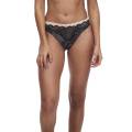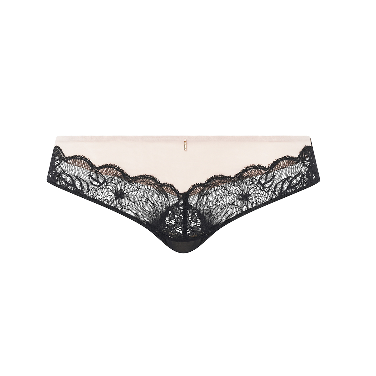 Труси – класичні із середньо – заниженою посадкою. Передня панель виконана з бежевого тюлю та доповнена вставками з контрастного чорного мережива з квітковим оргаментом, задня – з непрозорої мікрофібри.