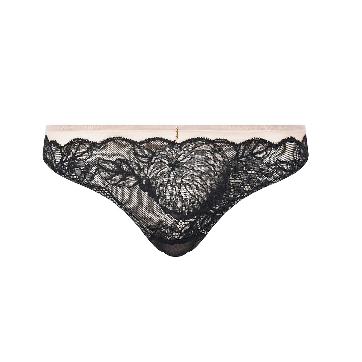 Труси – стрінги із середньо – заниженою посадкою. Передня панель виконана з чорного мережива з квітковим орнаментом та доповнена бежевим тюлем. Задня панель – з подвійного тюлю. Повністю дубльовані.