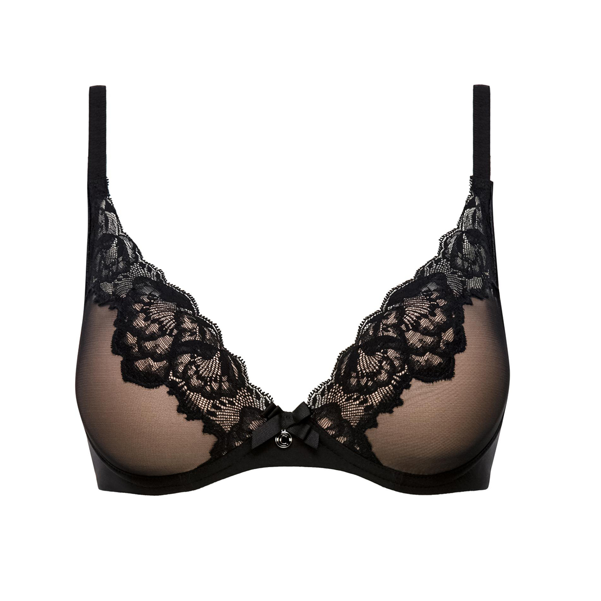 Бюстгальтер - пуш ап з інтегрованими (не виймаються) подушками у всіх розмірах. Чашки покриті тюлем і по лінії декольте декоровані мереживом. На центральній панелі розмістився бантик із золотавим логотипом. Регульовані бретелі. Бічні панелі дубльовані.
