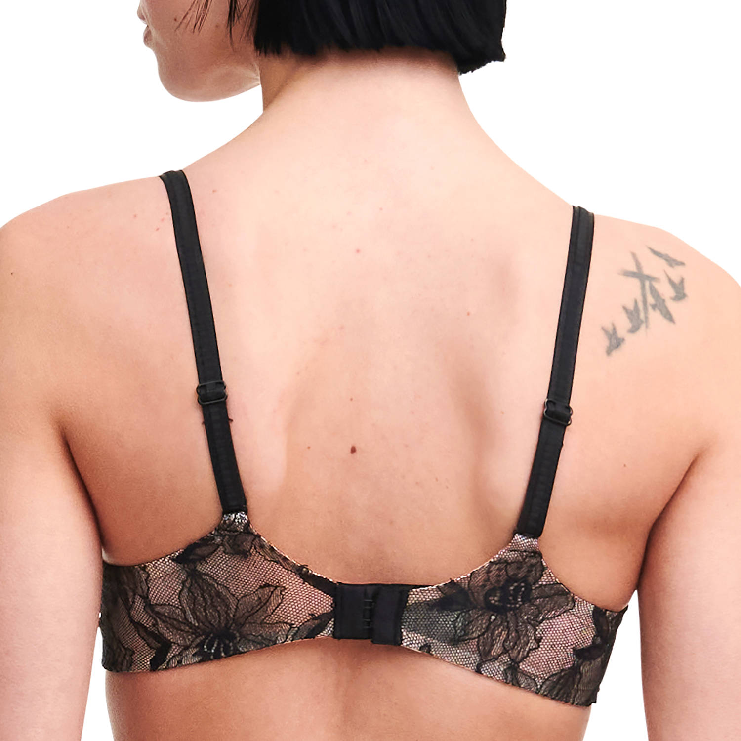 Бюстгальтер - пуш ап зі злегка ущільненою формою чашок з мусу з подушками, що виймаються. На кісточках. Чашки покриті мереживом з орнаментом з орхідей. Основи бретелей доповнені декоративною деталлю. Бічні панелі дубльовані. Регульовані бретелі. Для великих розмірів: балетна спинка – для збалансованого розподілу навантаження.