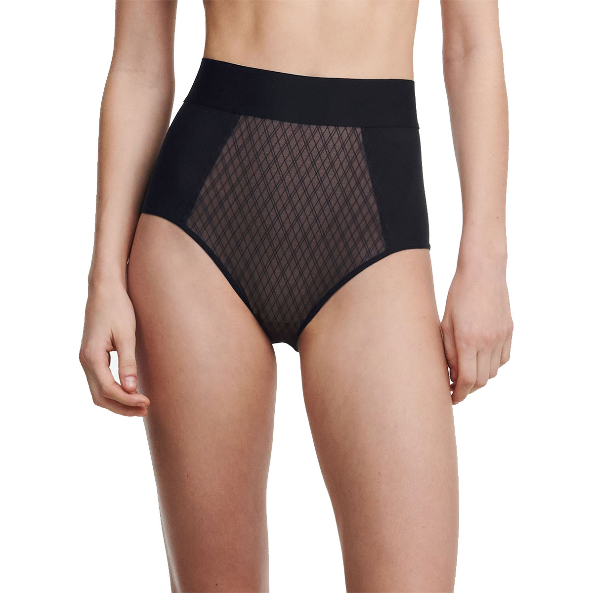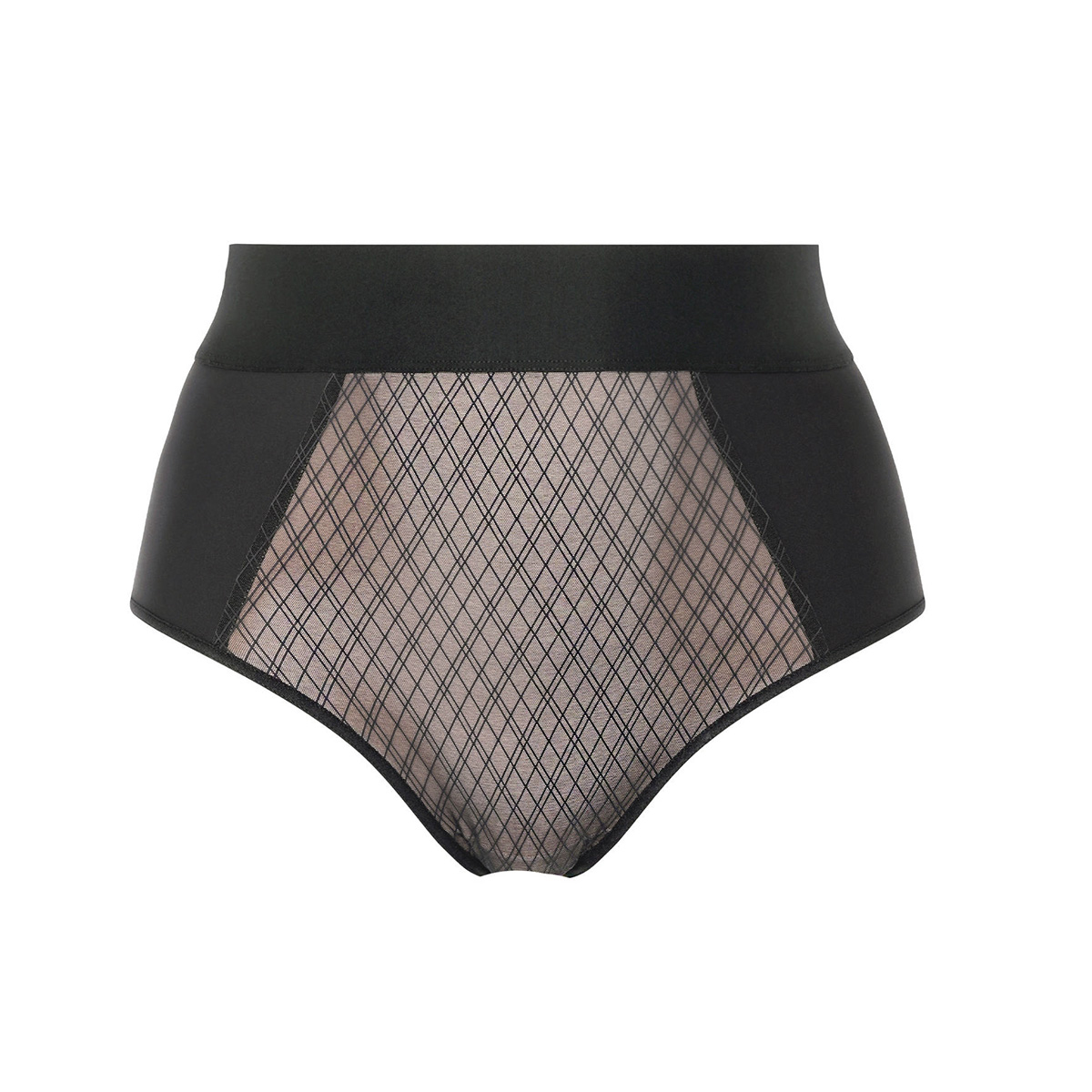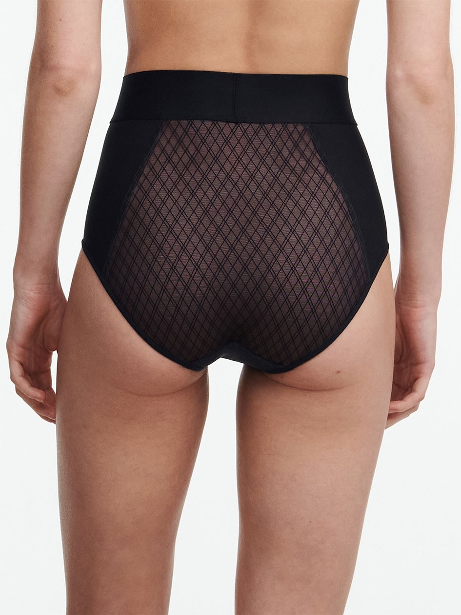 Труси з високою талією з високою посадкою. Передня та задня панелі виконані з тюлю з графічним орнаментом та дубльовані з внутрішньої сторони для уникнення прозорості. Бічні панелі – з м'якої непрозорої мікрофібри. По-верхньому краю – широкий еластичний безшовний пояс.