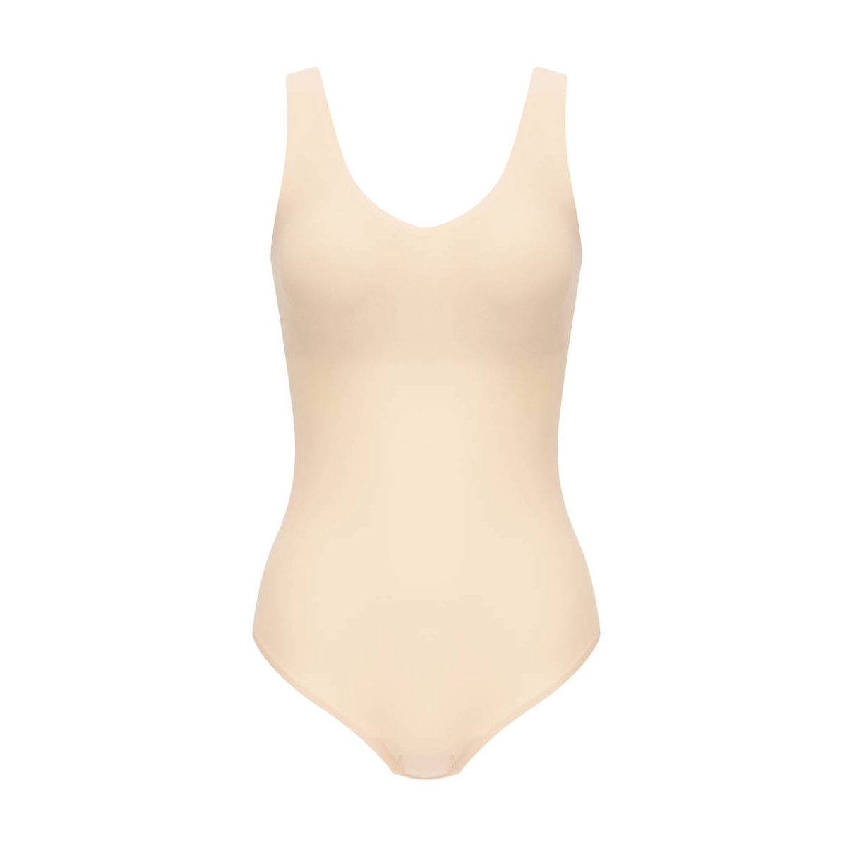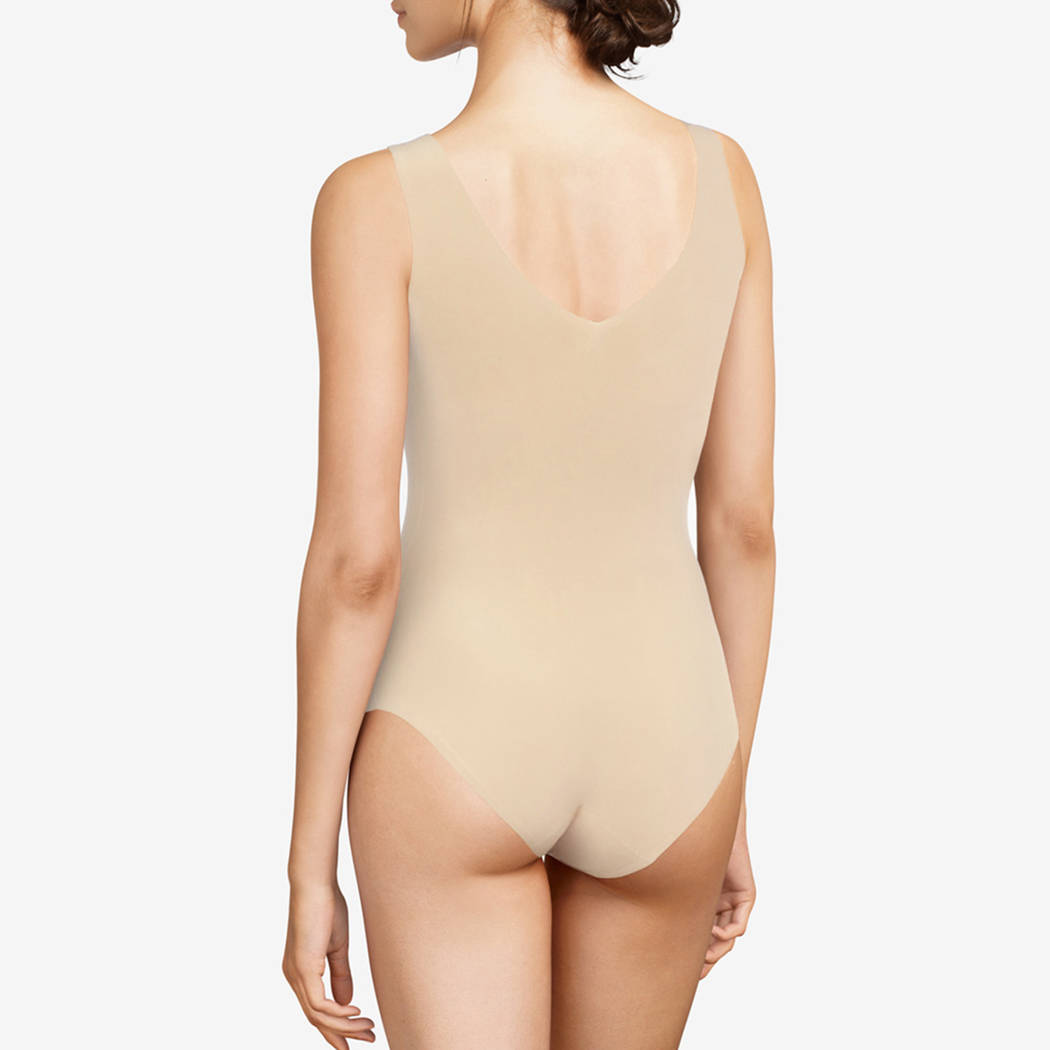 Гладкий боді з V-подібним вирізом, без кісточок. Оснащений інтегрованими подушками. Застібка між ніг на кнопки. Виконаний з м'якого та еластичного матеріалу, який має ефект "другої шкіри". Ця модель розроблена спеціально для того, щоб слідувати за рухами Вашого тіла, але залишаючись на місці протягом дня.