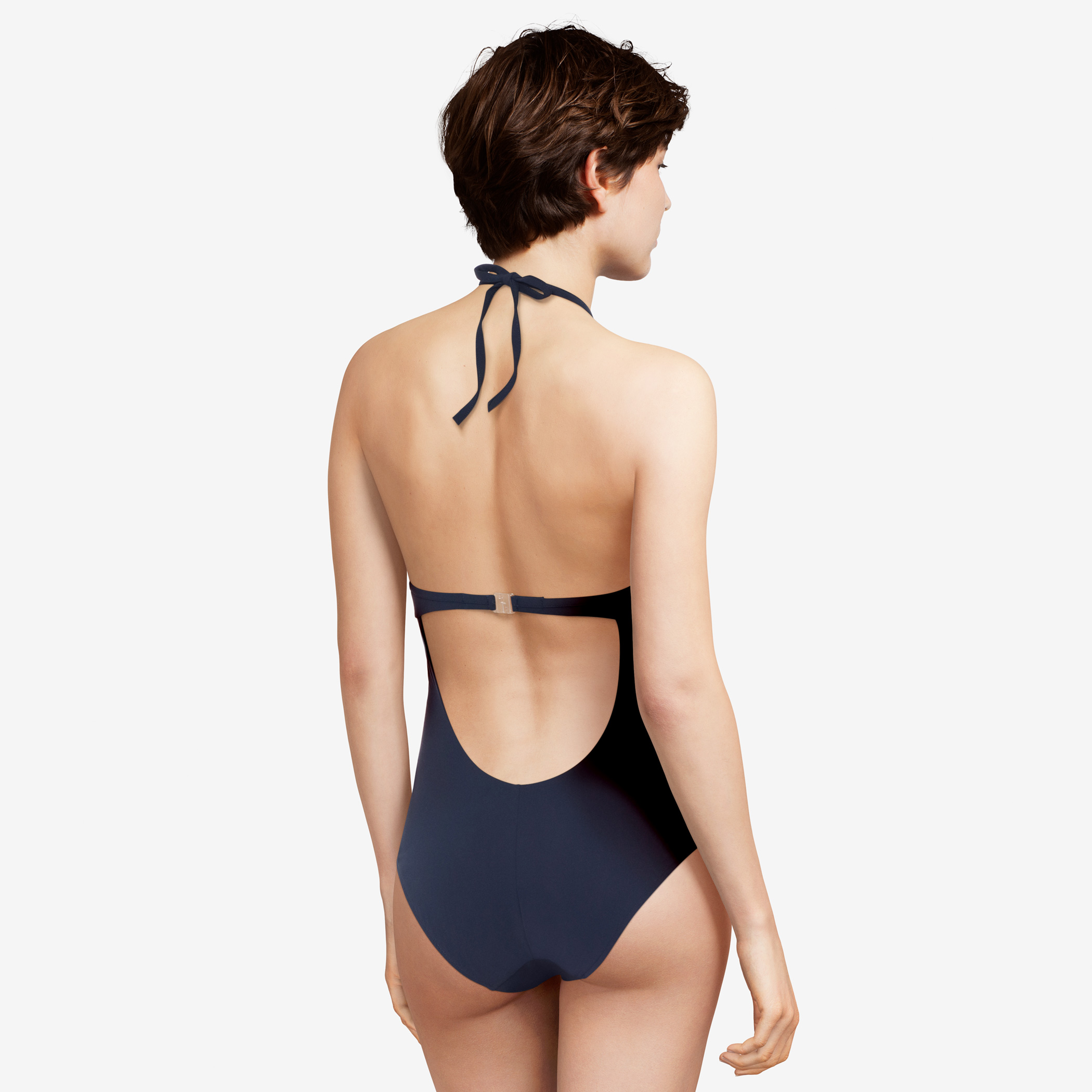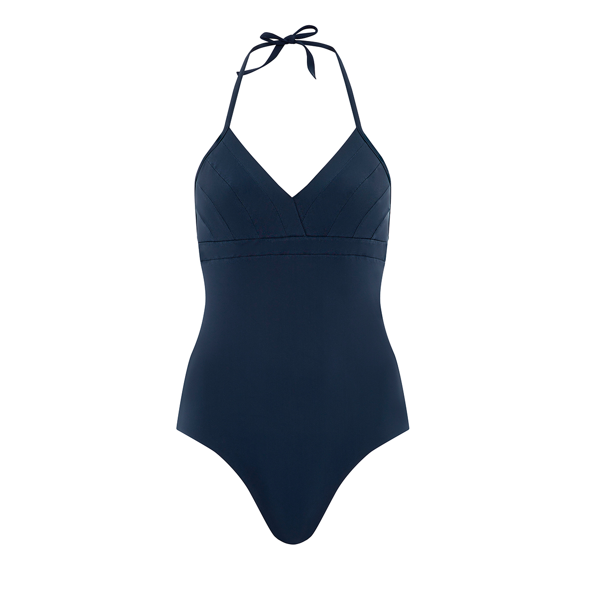 Цільний купальник із злегка ущільненою трикутною формою чашок без кісточок. Чашки покриті мікрофіброю в смужку, що надає морському стилю. Бретелі зав'язуються довкола шиї. Округла відкрита спинка – на застібці.