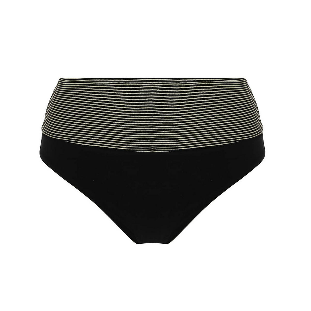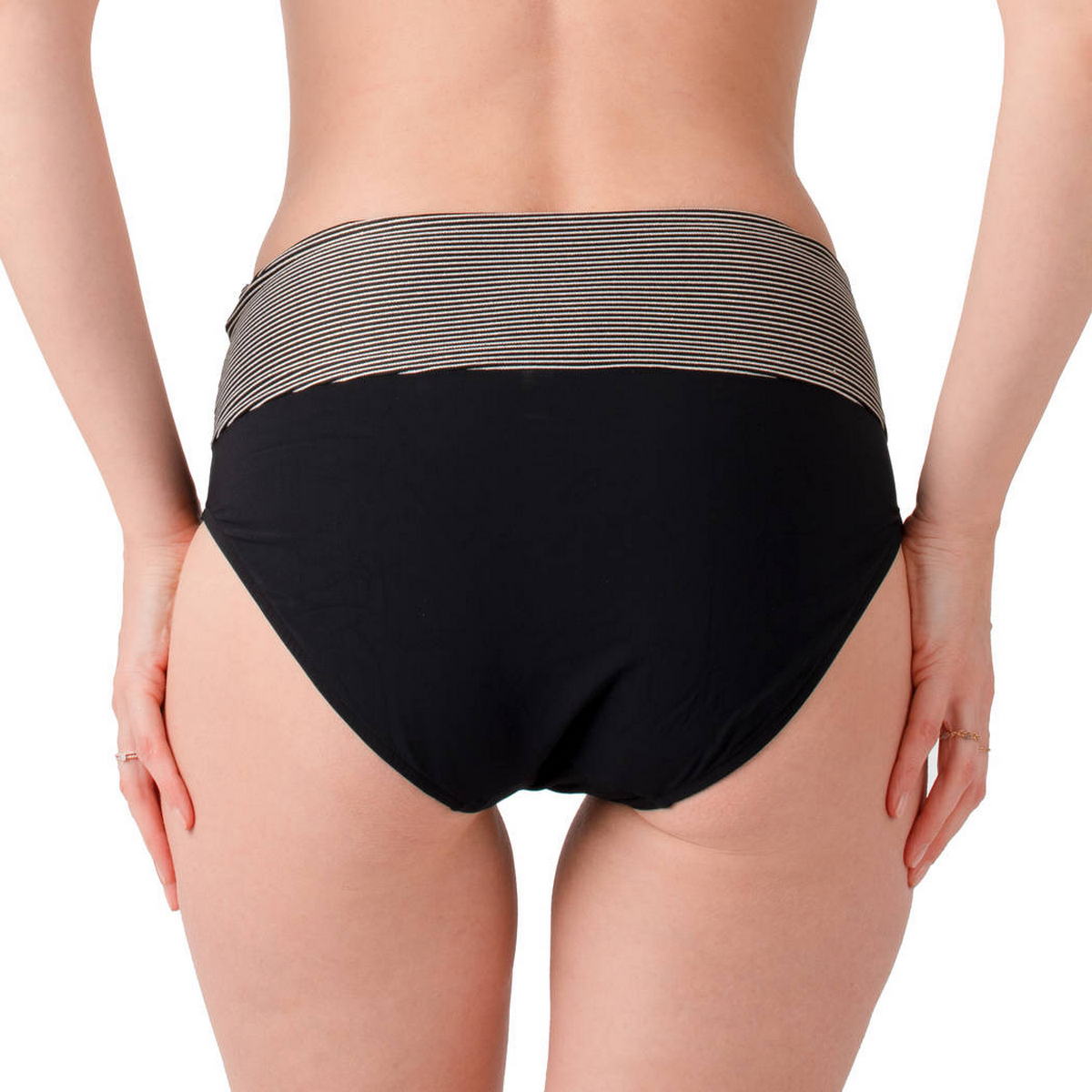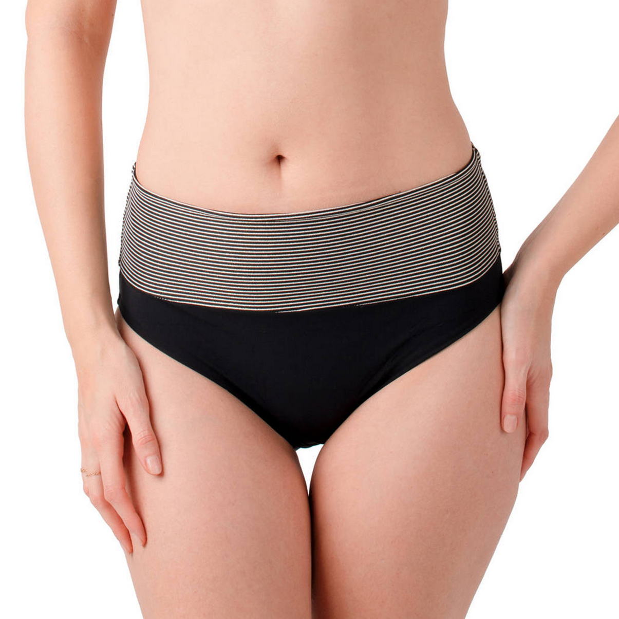 Труси-кюлоти з високою талією. З поясом, що відвертається та дозволяє регулювати висоту, а також візуально моделювати живіт і стегна. Виконані з однотонної тканини з контрастним "смугастим" поясом.