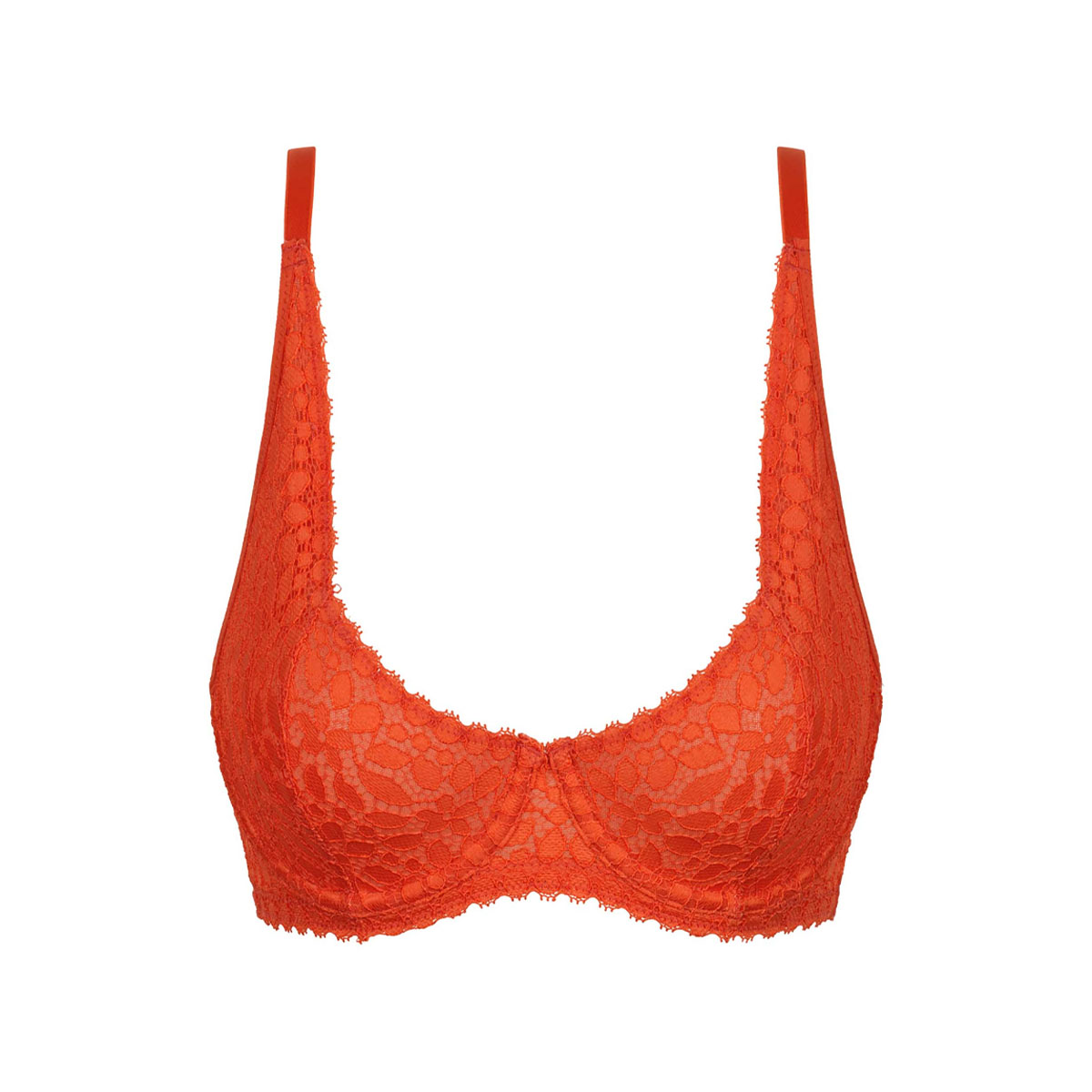 Бюстгальтер – балконет з м'якою, досить відкритою формою чашок на кісточках. Чашки виконані з ажурного мережива з квітковим орнаментом, з внутрішнього боку дубльовані тюлем для додаткової підтримки. Основа бюстгальтера також виконана з ажурного мережива. Область декольте та основа доповнені декоративними зубчиками. "Балетна" спинка - для збалансованого розподілу навантаження для "пишних" форм. Широкі бретелі, що регулюються.